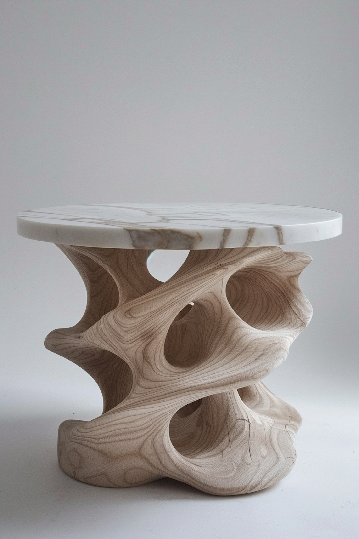 Modern table with a marble top and sculptural wooden base, featuring organic shapes and elegant design.