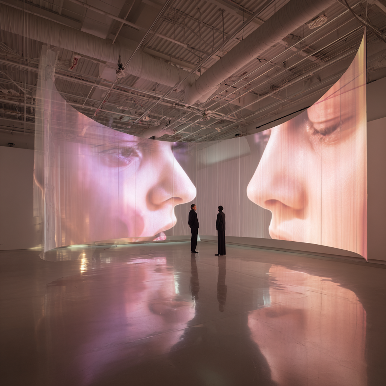 A modern art installation with large, illuminated face projections on semi-transparent screens, observed by two individuals in a gallery.