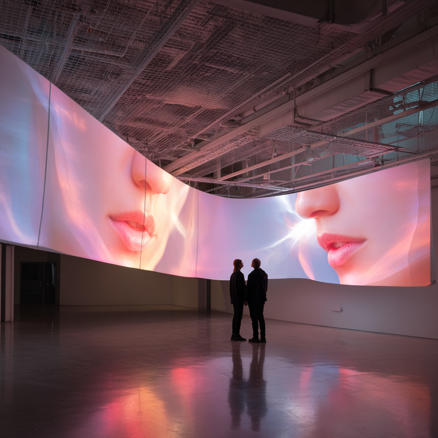 A modern art installation with a curved screen displaying a close-up of a face, observed by two silhouetted figures in a spacious gallery.