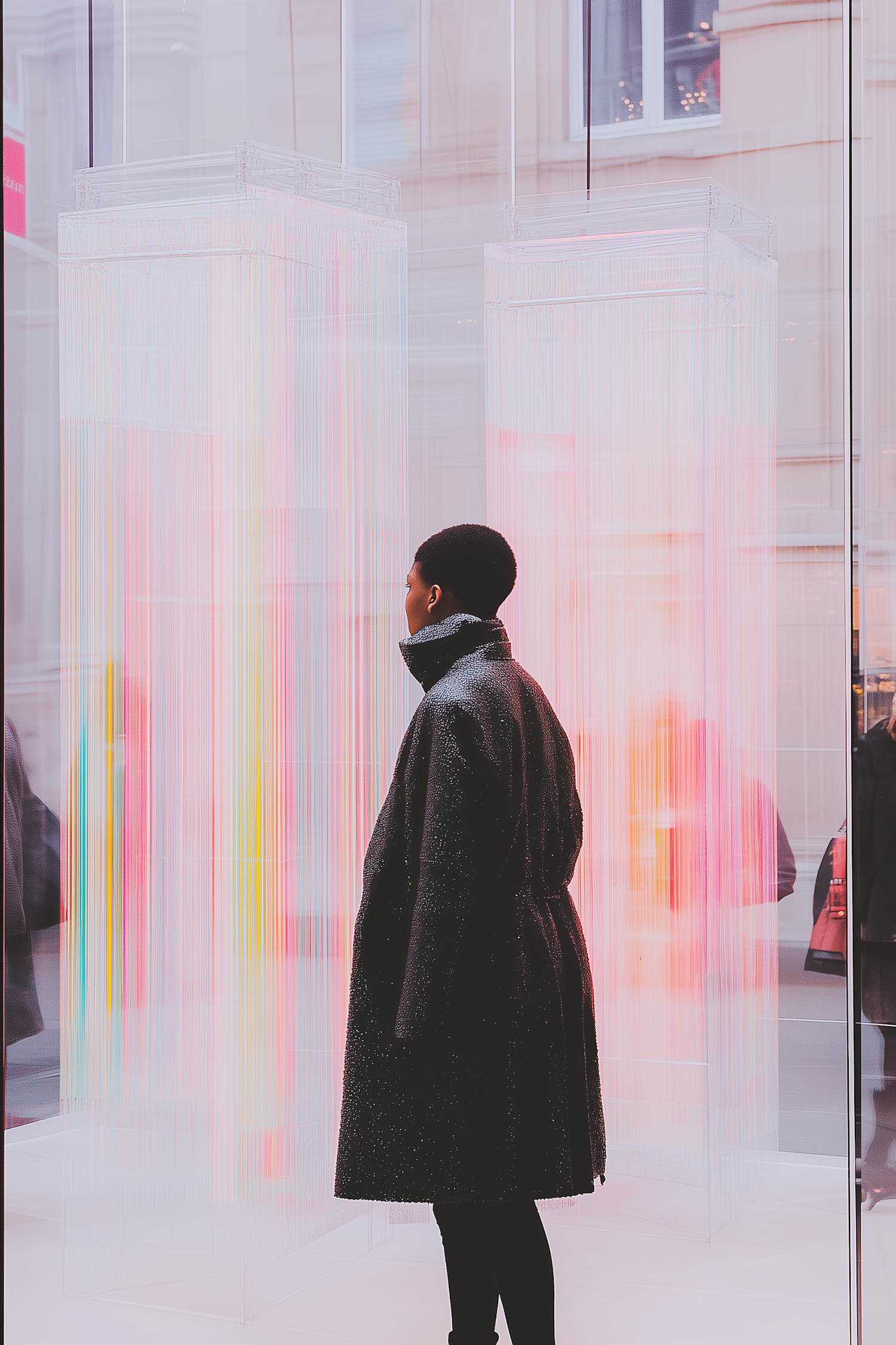 A person in a dark coat observes a colorful light installation with pastel hues in a modern, urban setting.