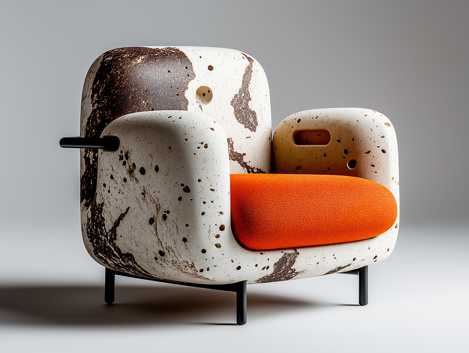 A stylish chair with a speckled brown and white body, contrasting with a vibrant orange cushion, featuring sleek black legs.