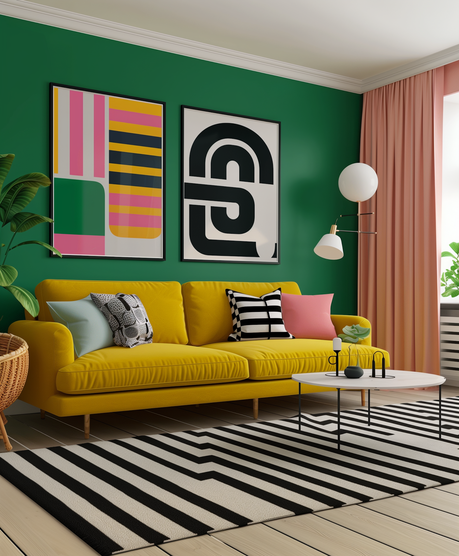 Modern living room with green walls, yellow sofa, abstract art, striped rug, and pink curtains for a bold, colorful aesthetic.