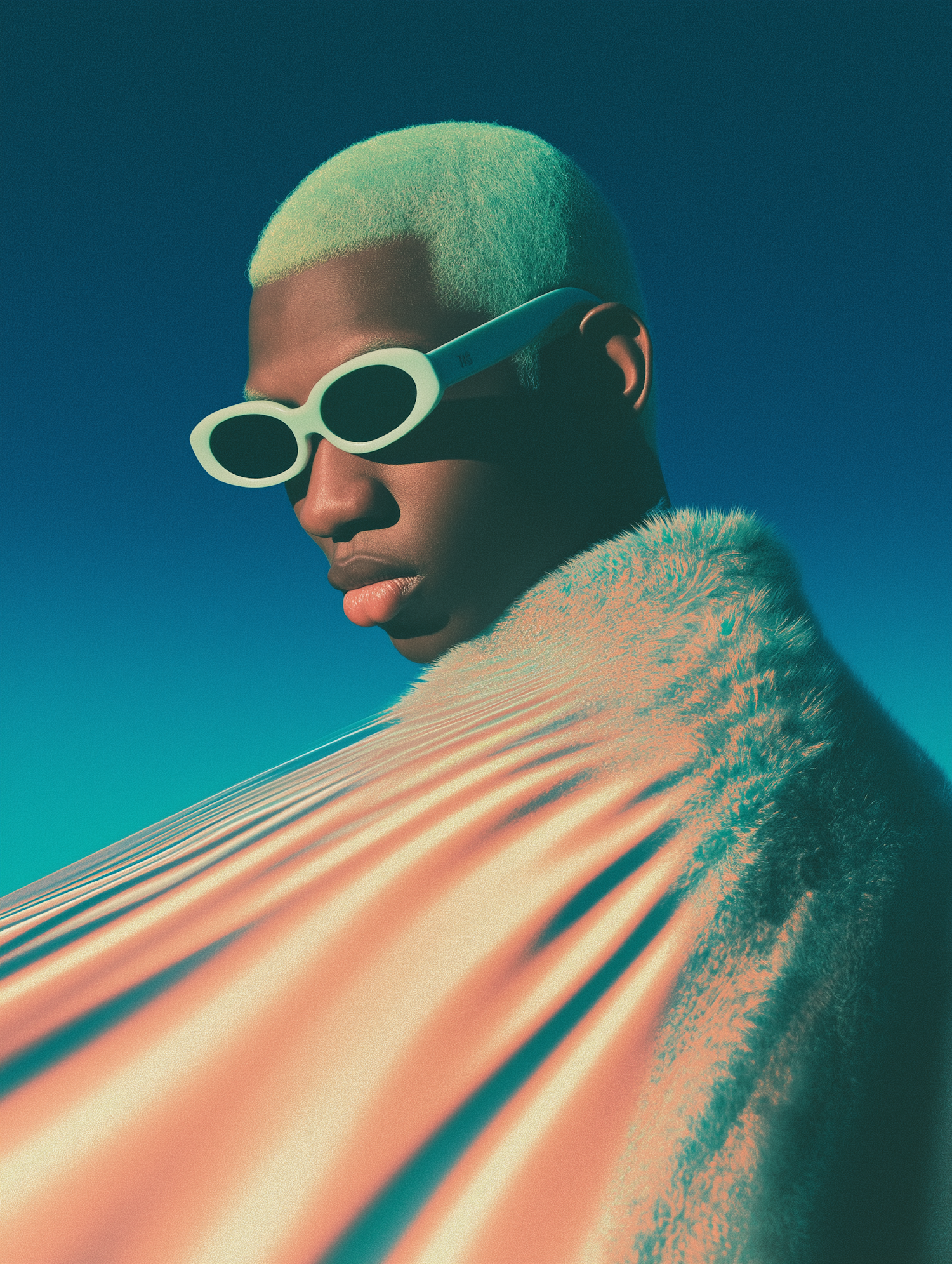 Stylish portrait of a person with light hair, white sunglasses, and a fur-like garment against a gradient blue background.