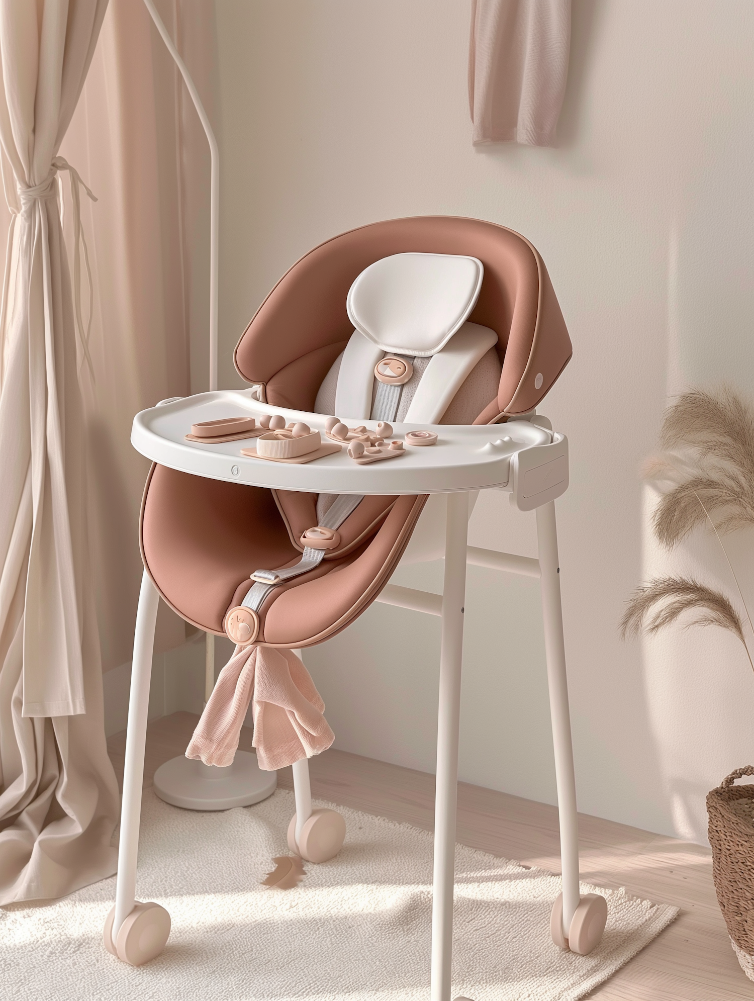 Elegant high chair in soft pink and white with toys on tray, set in a cozy, softly lit room with curtains and a textured rug.