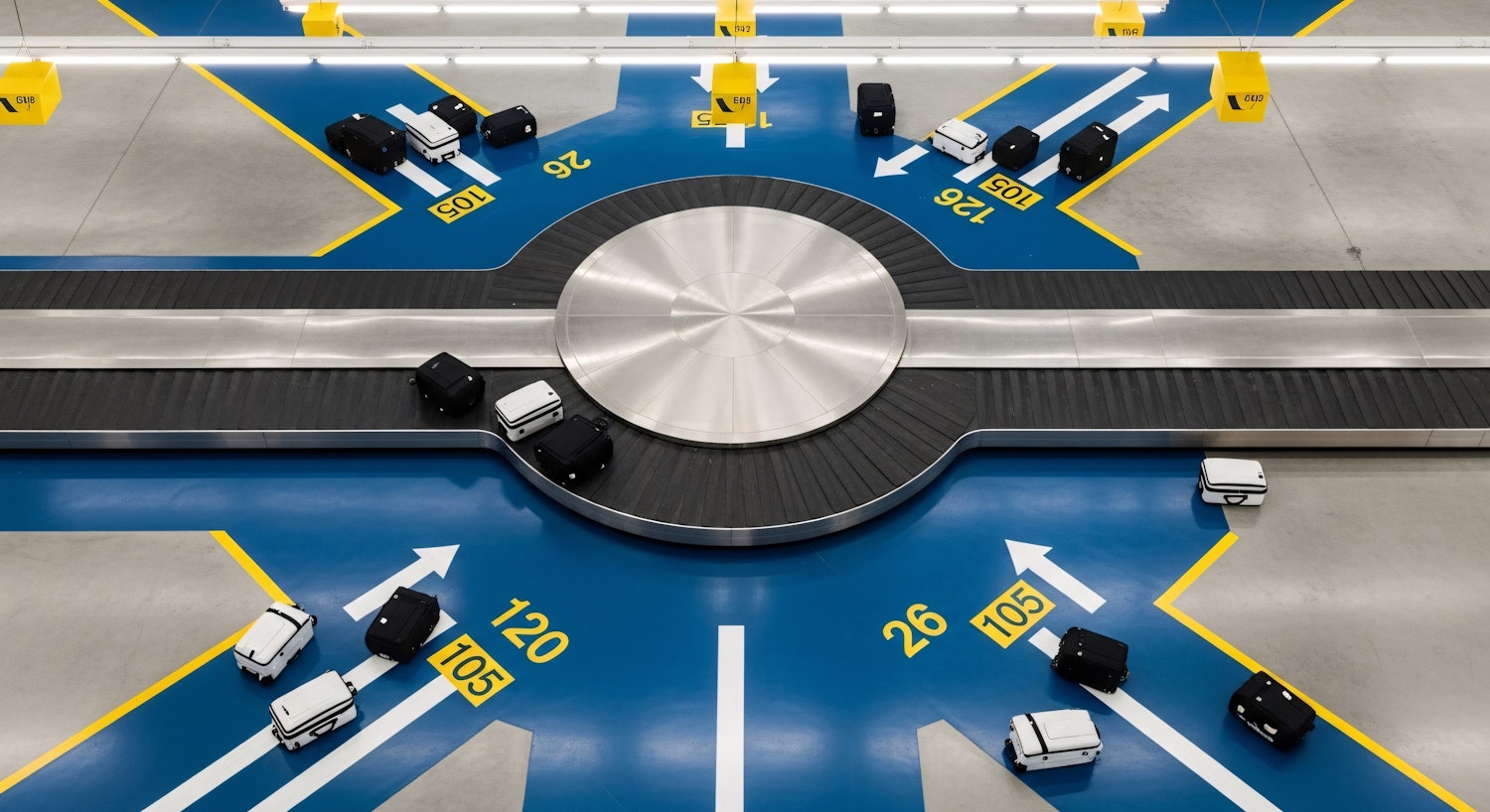 Modern airport baggage claim with a circular conveyor belt, vibrant blue floor, and scattered black and white suitcases.
