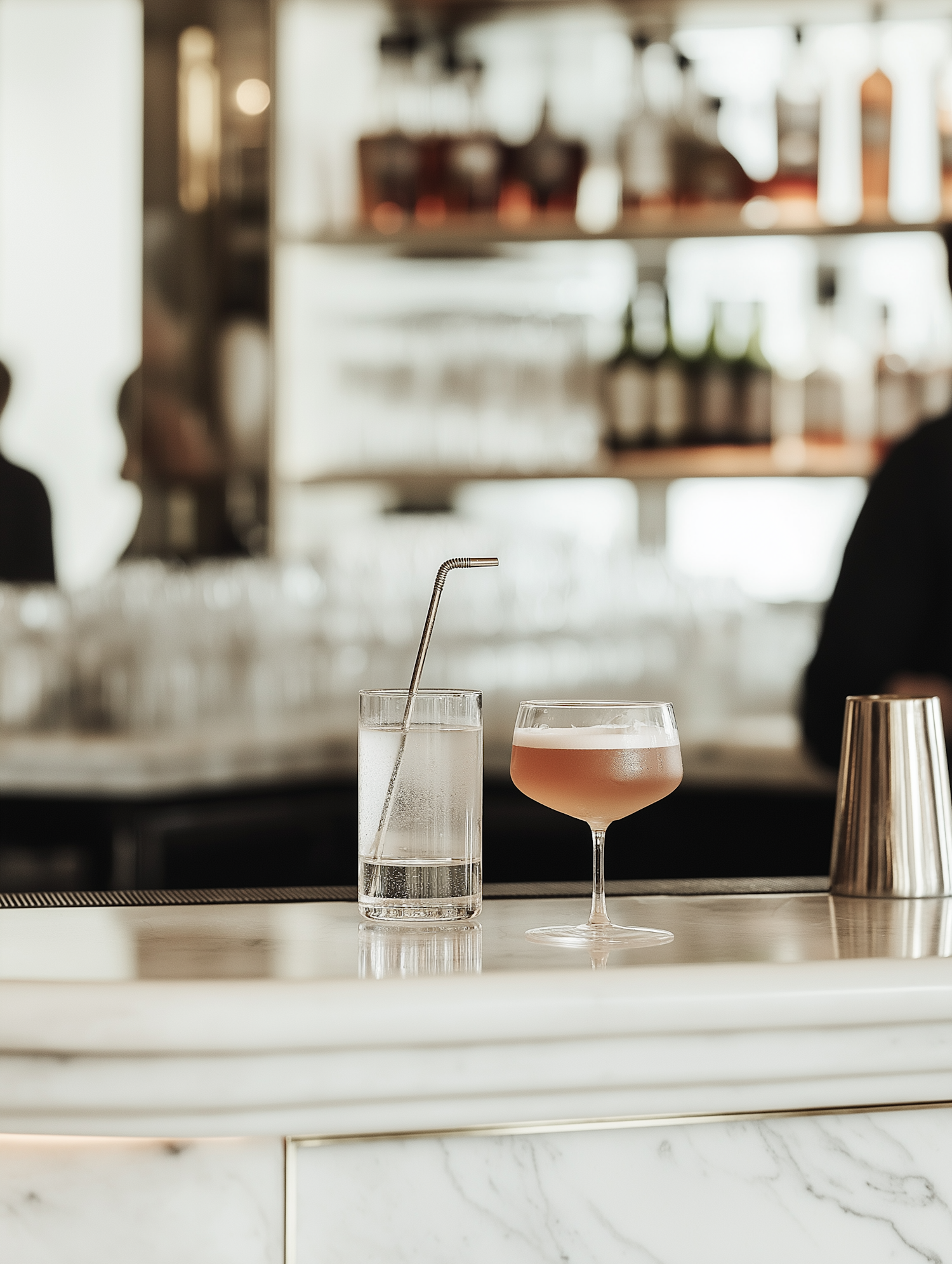 Elegant marble bar with a frothy pink cocktail and sparkling water, set against a blurred backdrop of bottles and glassware.