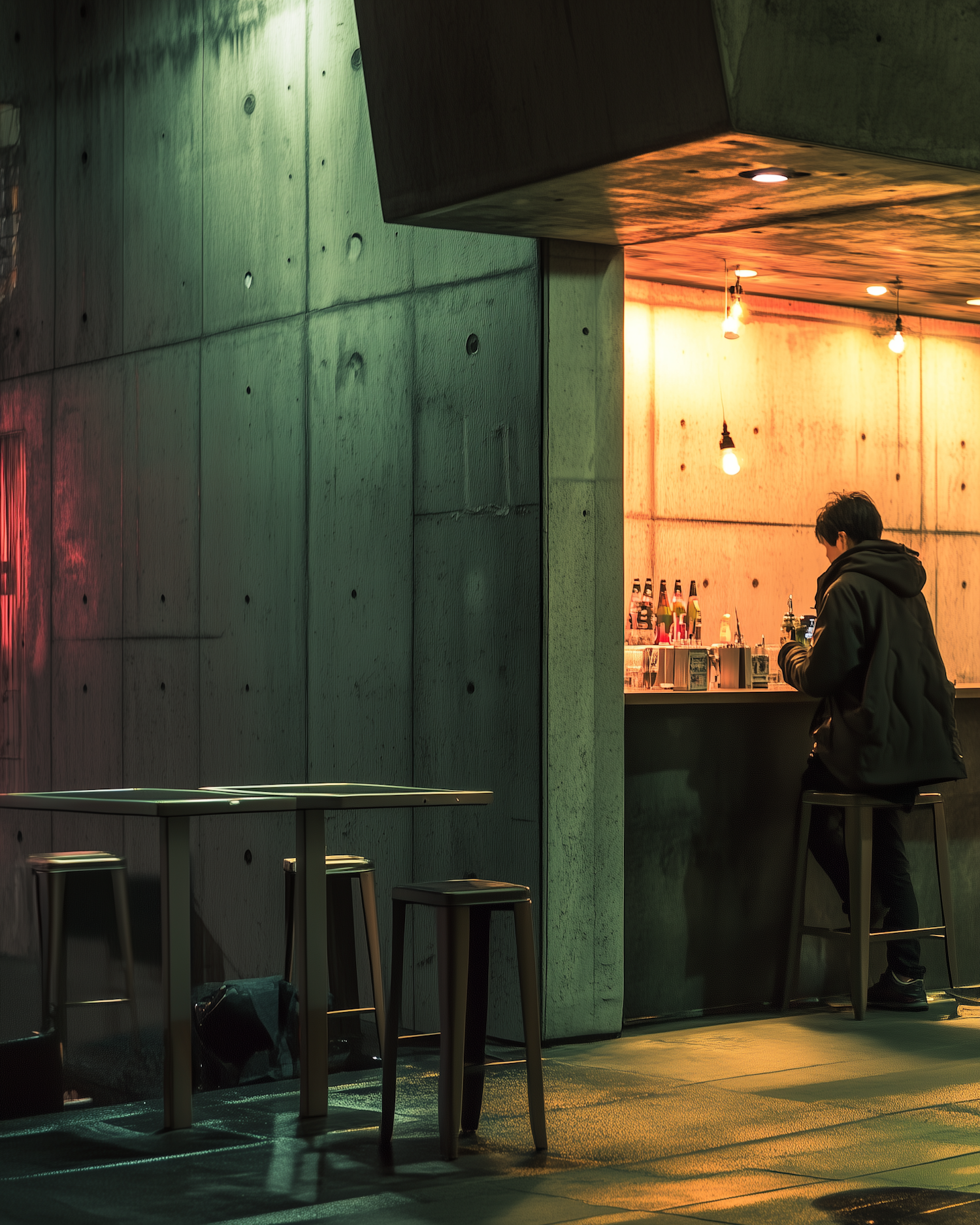 Moody urban bar scene with industrial design, warm lighting, and a solitary figure at the counter. Modern and atmospheric.