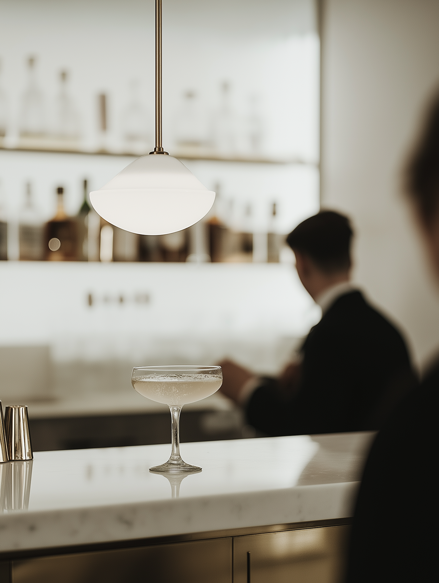 Elegant bar scene with a coupe glass cocktail on a marble counter, soft lighting, and a blurred bartender in the background.