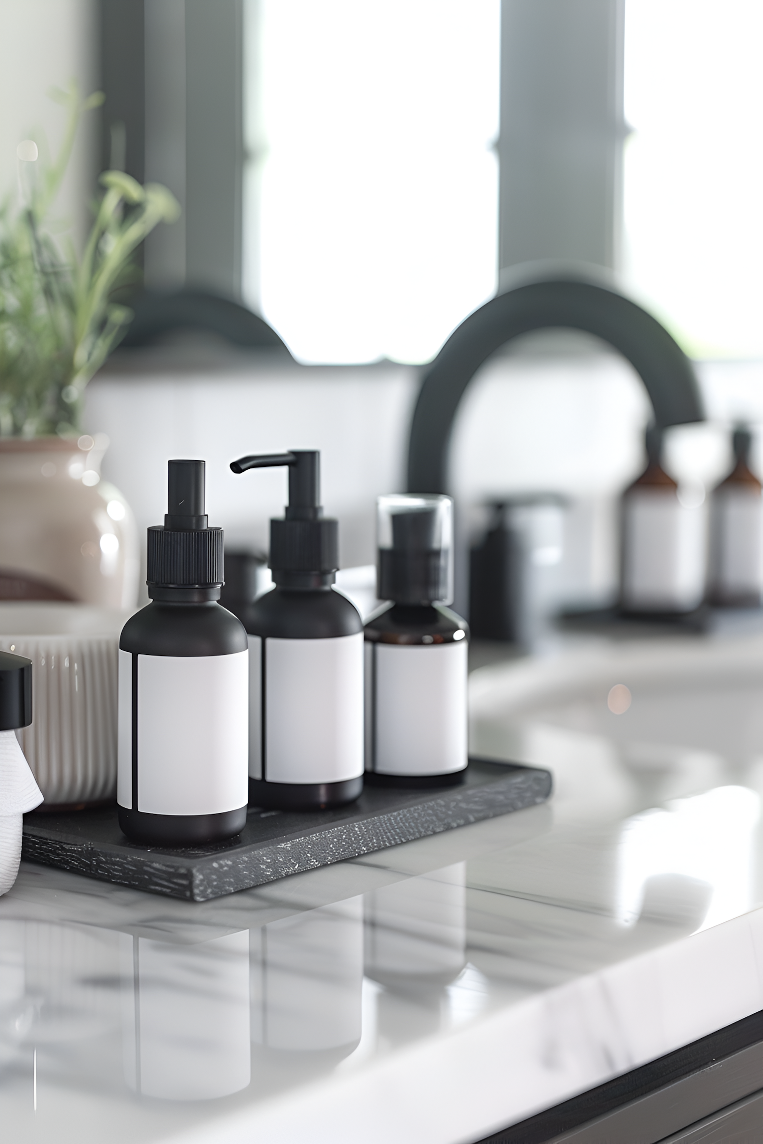 Elegant bathroom countertop with black and white pump bottles on a marble surface, complemented by a potted plant and modern faucet.