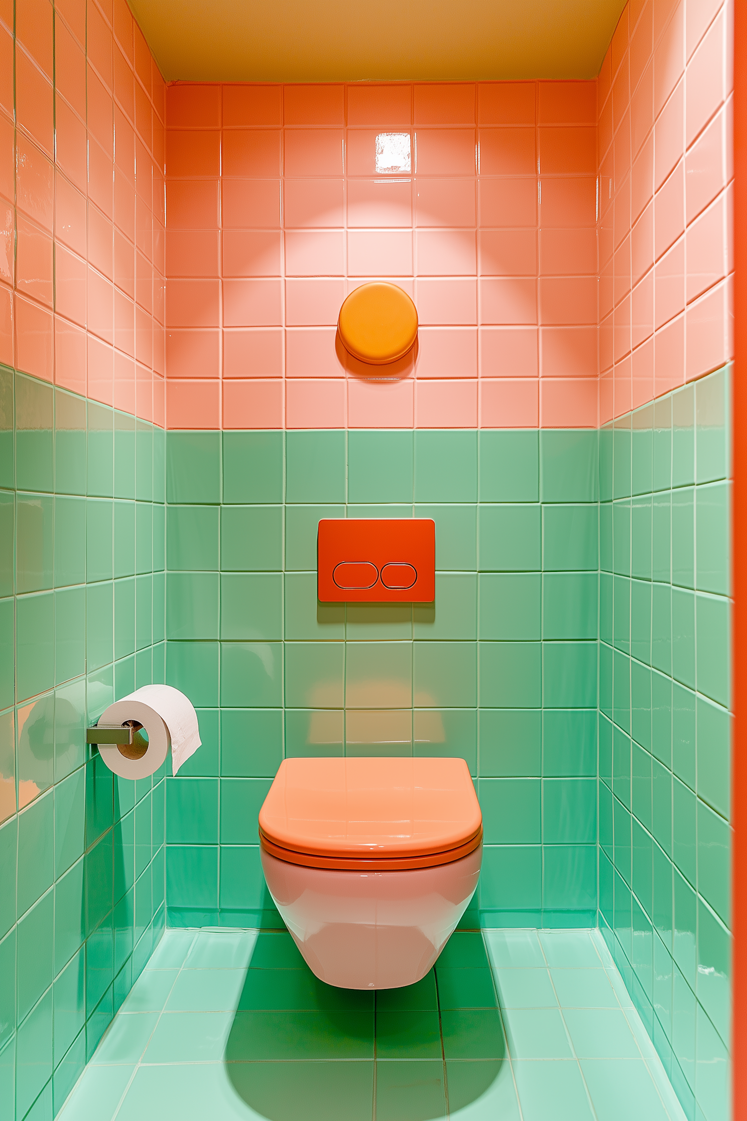 Bright bathroom with coral pink and mint green tiles, a wall-mounted toilet, and matching coral accents for a bold, modern look.