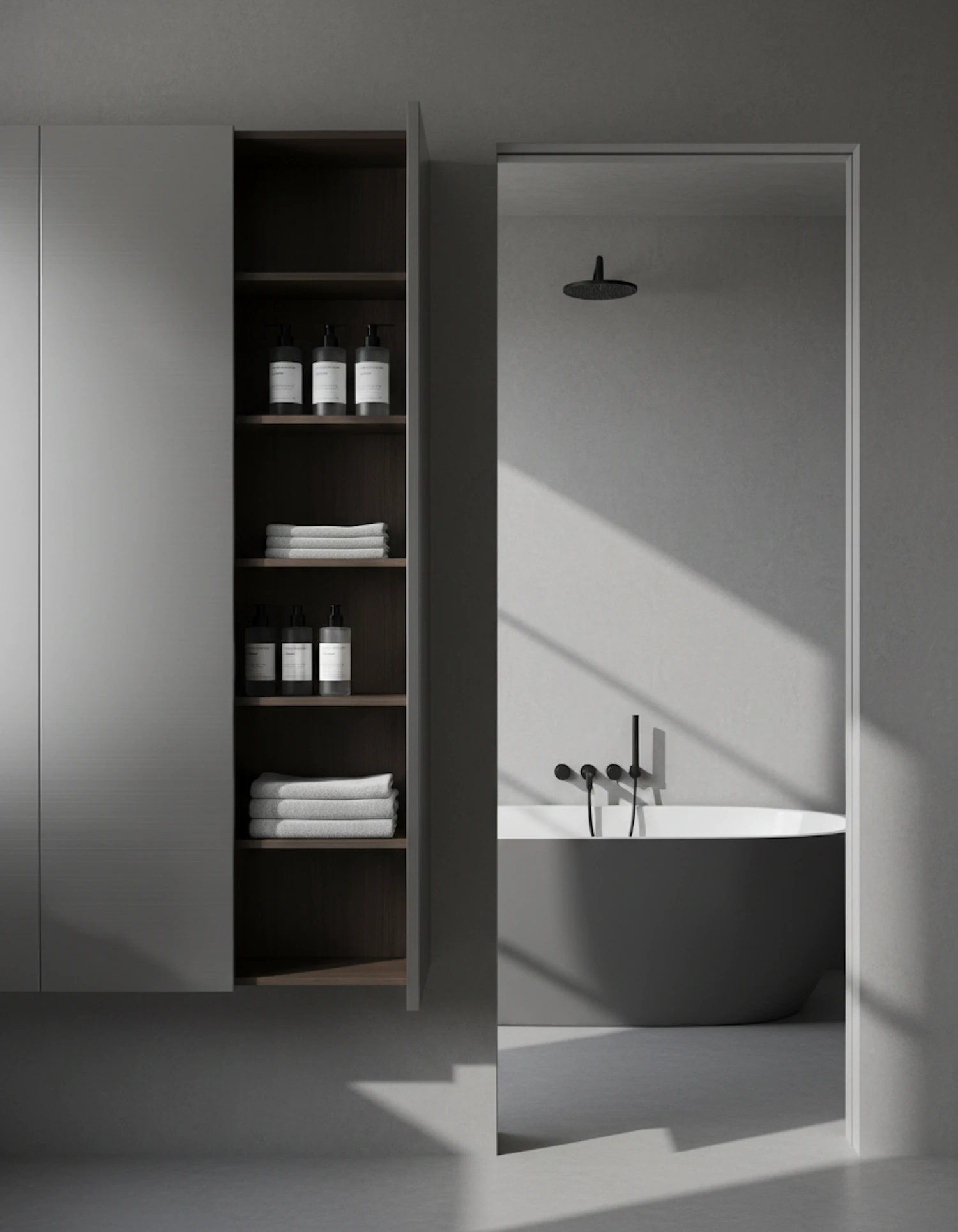 Modern bathroom with minimalist design, featuring a sleek bathtub, black fixtures, and an organized cabinet with towels and toiletries.