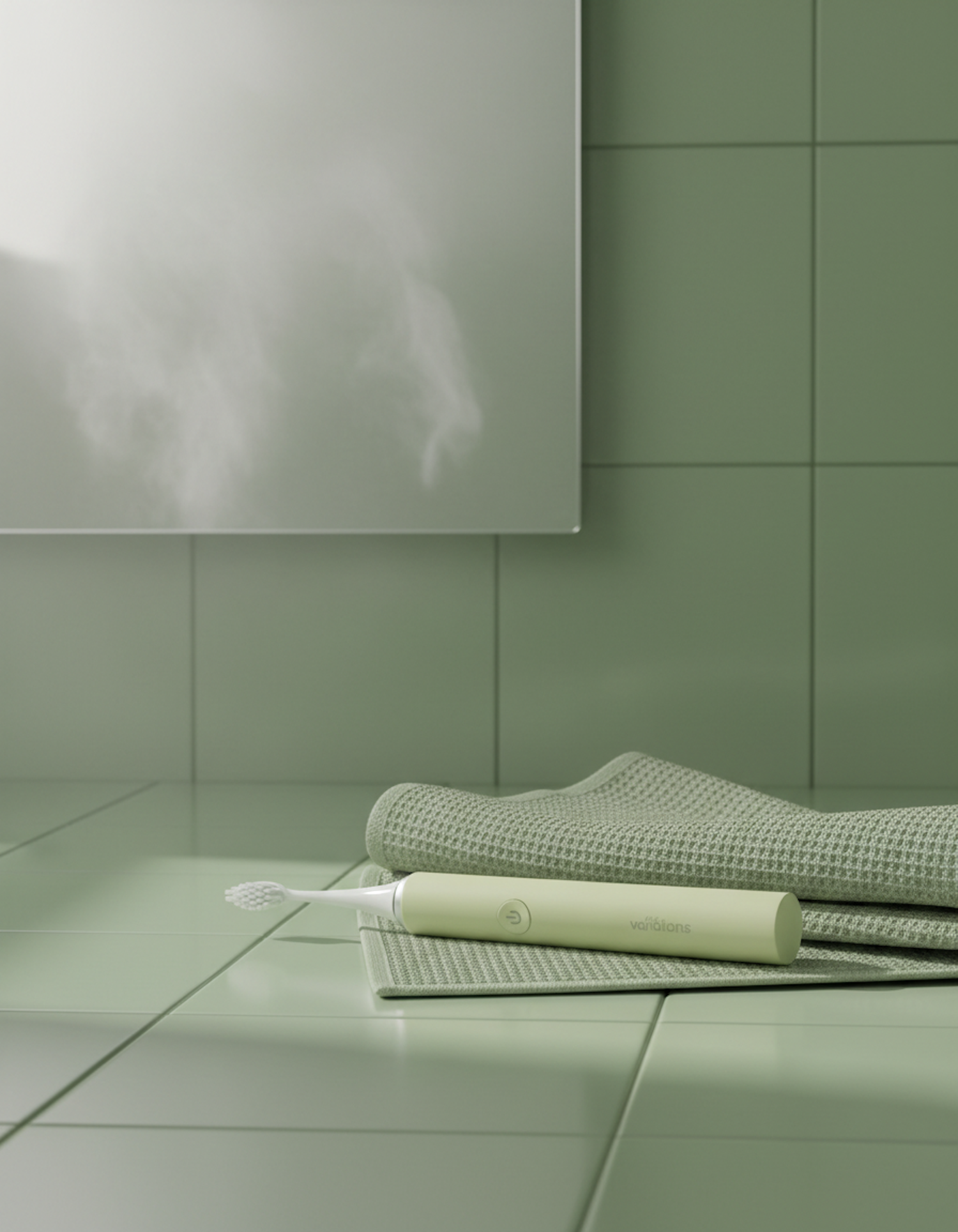 A sleek green electric toothbrush on a matching towel in a modern bathroom with green tiles and a fogged mirror.