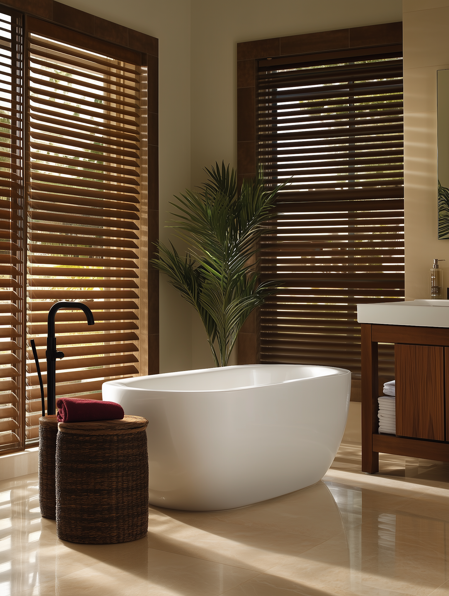 Modern bathroom with a white tub, wooden blinds, wicker stools, and lush greenery, creating a warm and serene spa-like atmosphere.