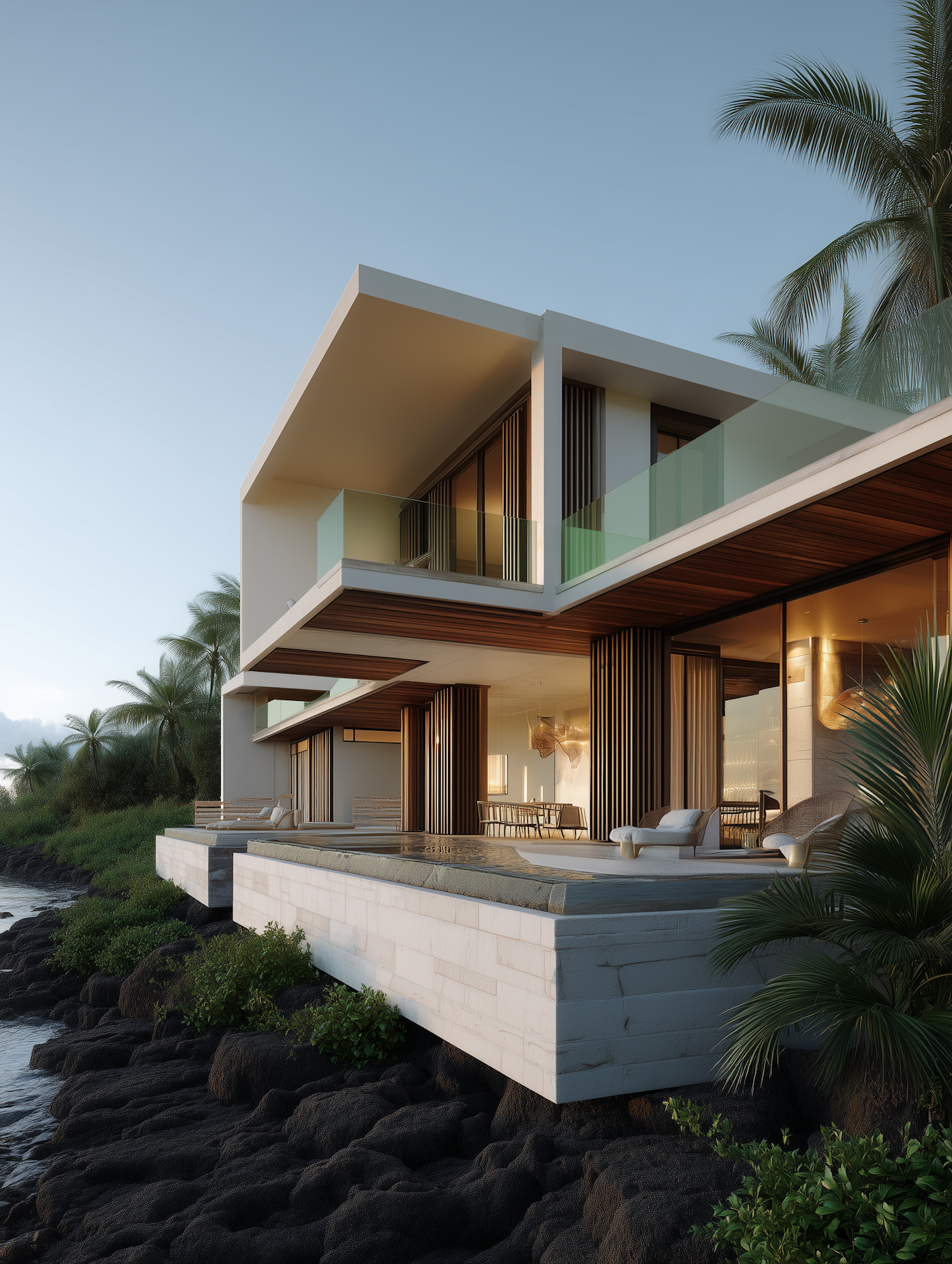 Modern beachfront villa with sleek design, glass walls, and tropical vibes, set against volcanic rocks and lush greenery by the ocean.