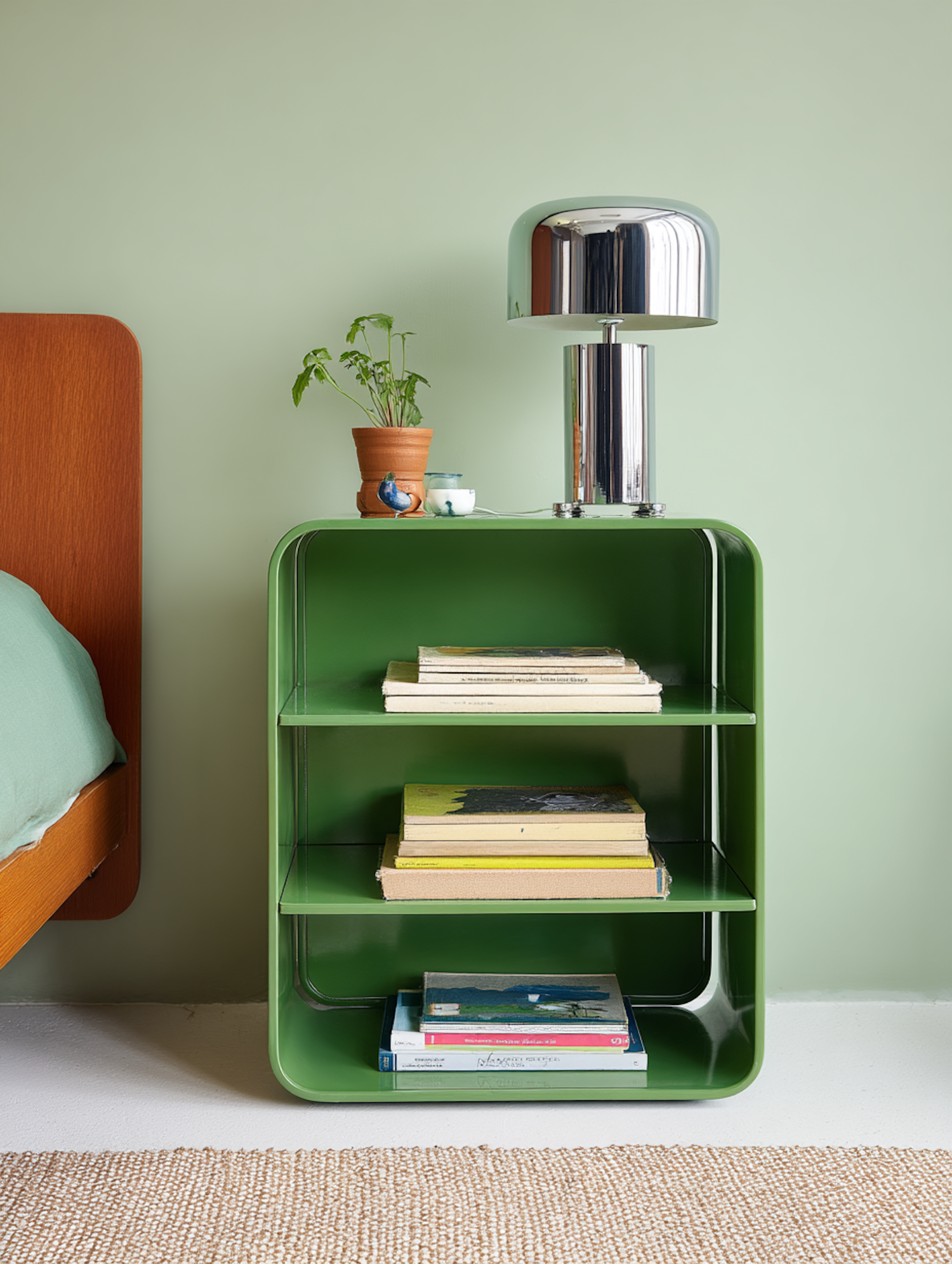 Stylish green bedside table with books, a chrome lamp, and a potted plant against a pastel green wall. Perfect modern bedroom decor.