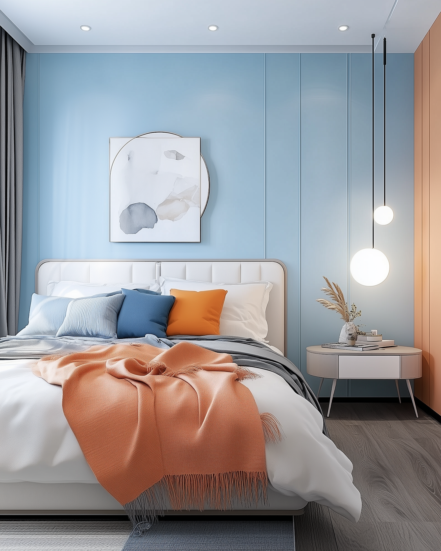 Modern bedroom with light blue walls, orange accents, and cozy bedding. Features pendant lights, abstract art, and a sleek nightstand.