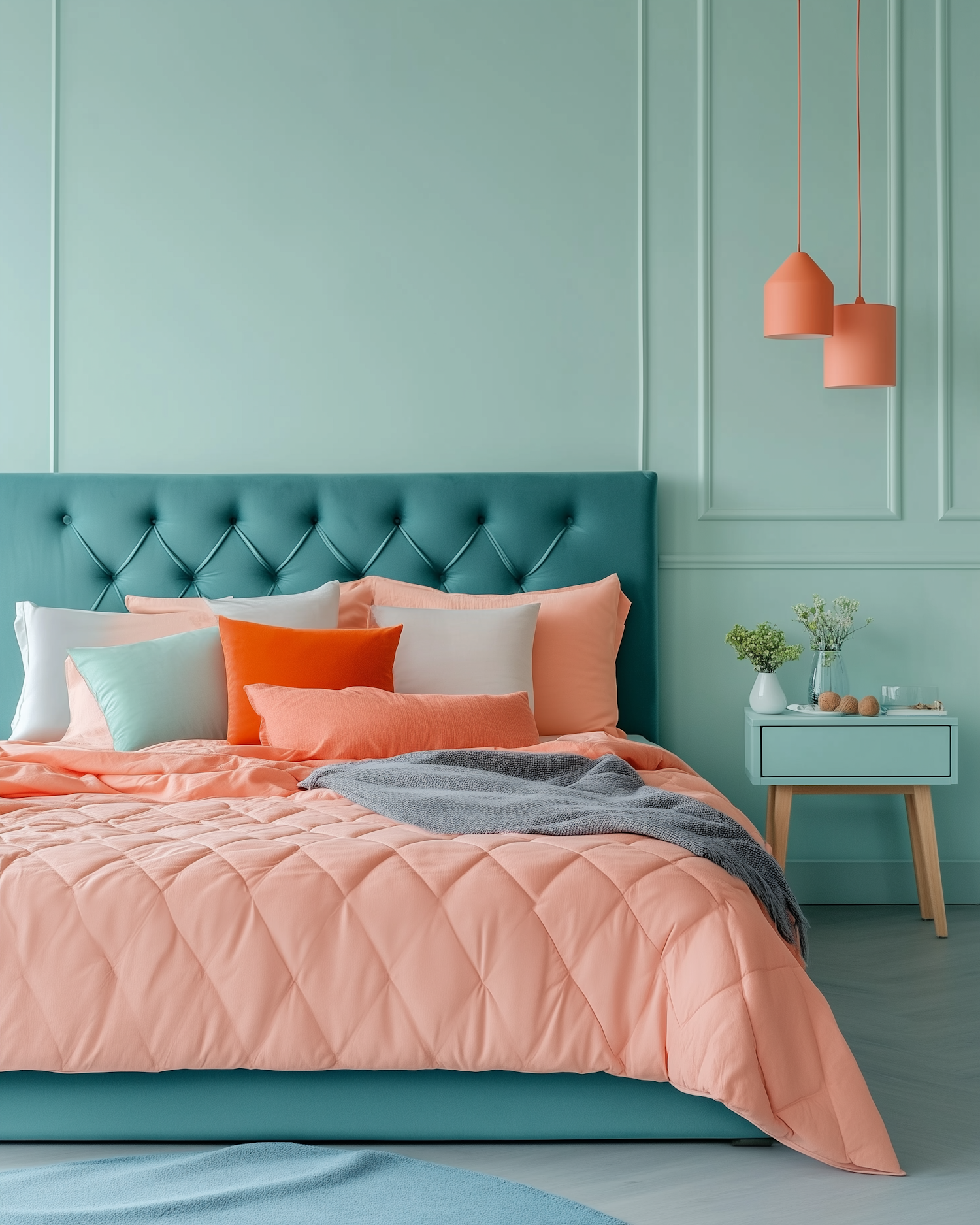 Modern bedroom with teal and peach decor, tufted headboard, colorful pillows, coral pendant lights, and a stylish bedside table.