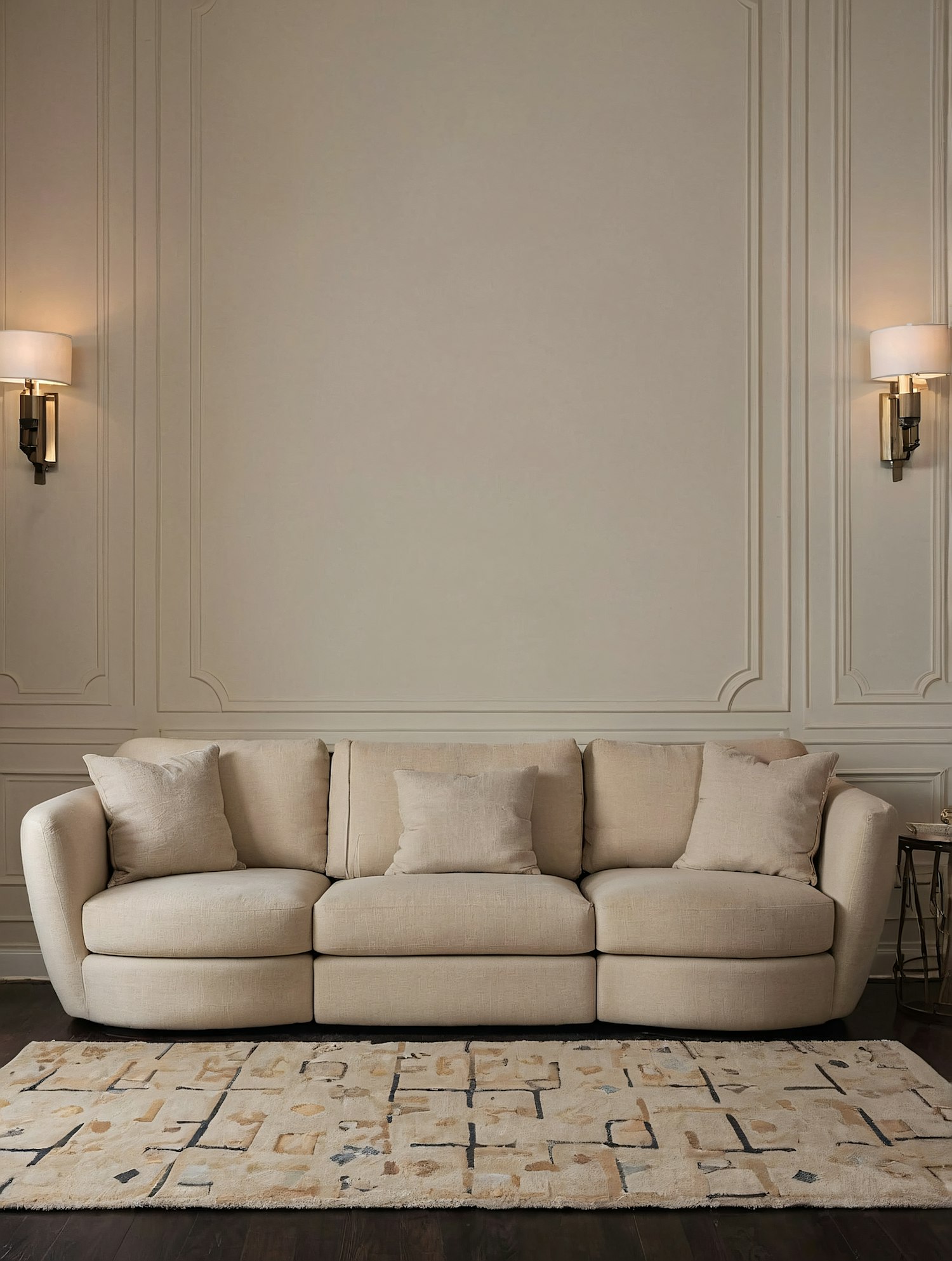 Modern beige sofa with matching pillows, abstract rug, and elegant wall sconces in a minimalist, neutral-toned living room.