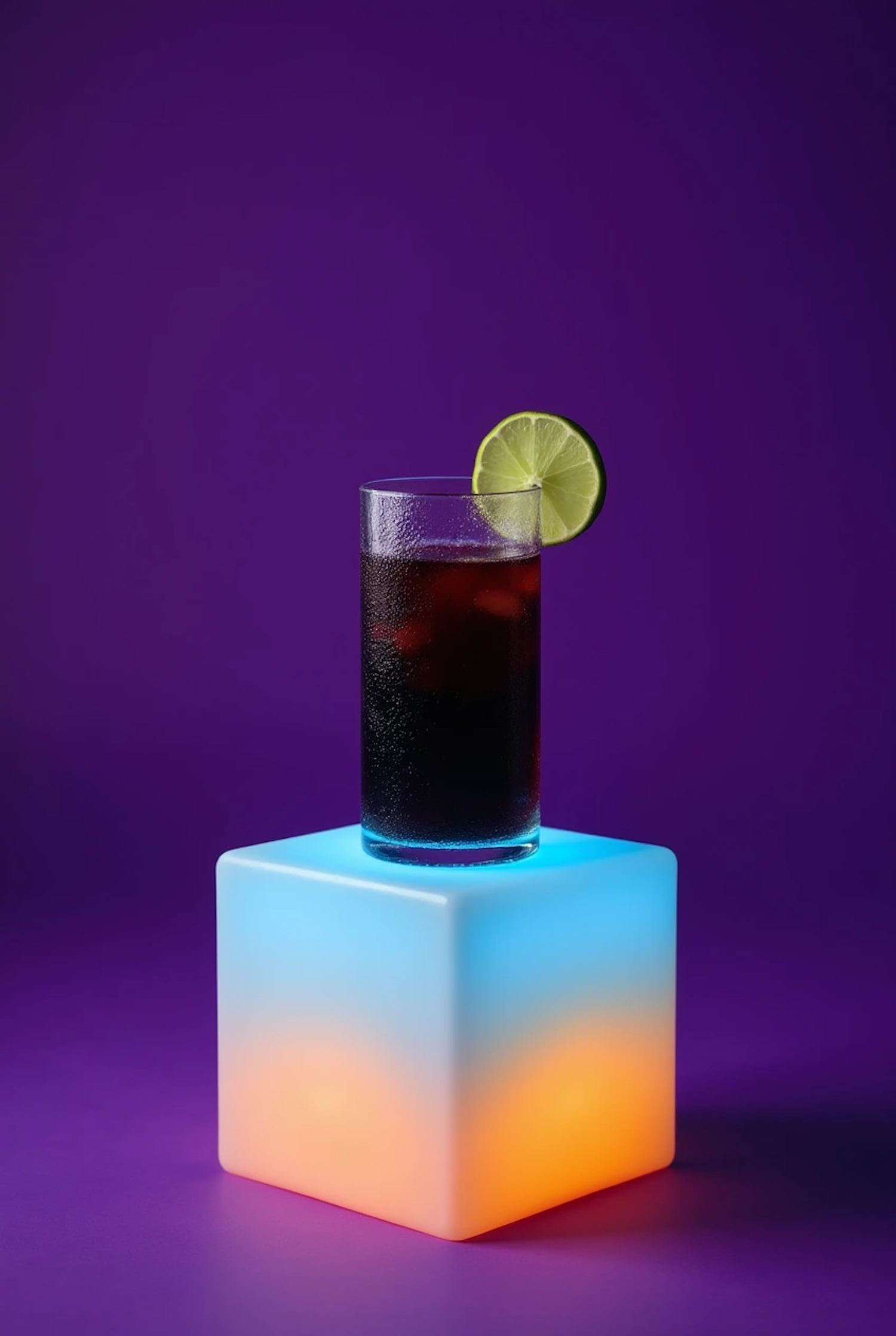 Tall glass with dark drink and lime slice on a glowing cube, set against a purple background. Modern and vibrant composition.