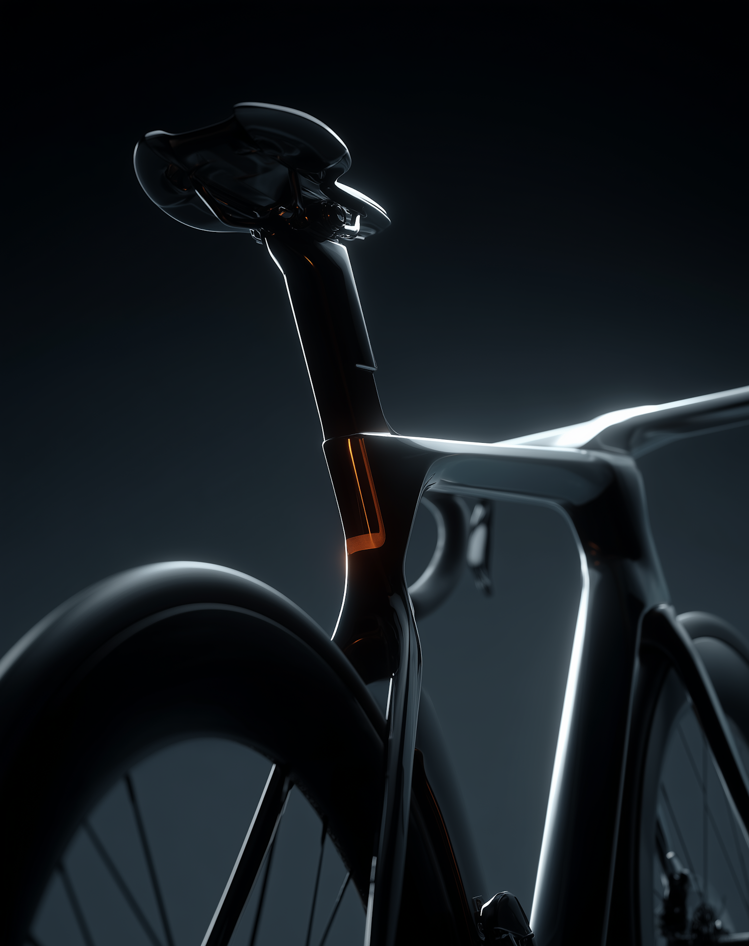 Close-up of a sleek, modern bicycle frame with a glossy black finish and orange accents, showcasing its aerodynamic design.