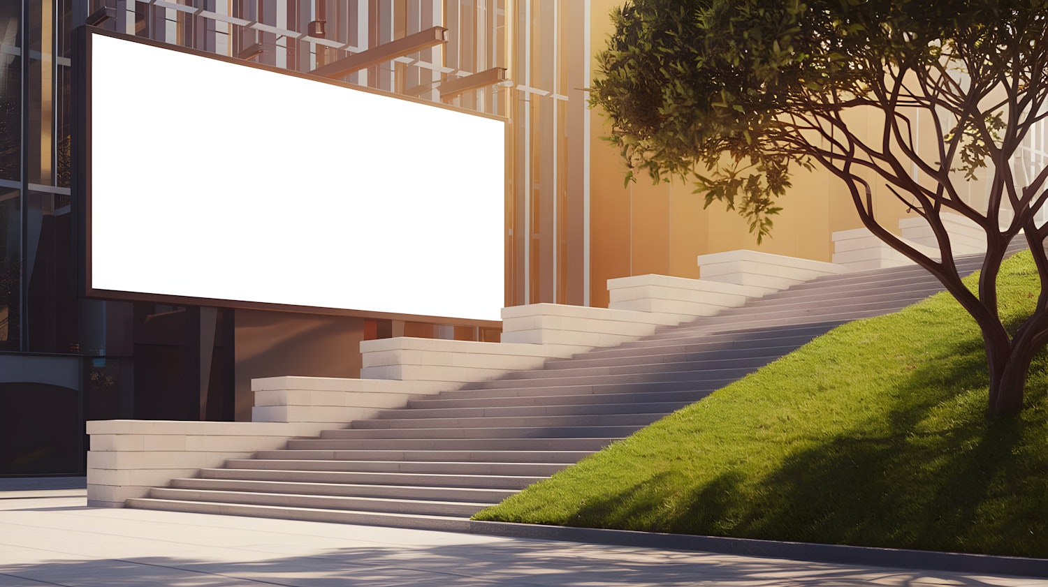 Modern outdoor billboard with blank space, stone steps, grassy slope, and tree in warm sunlight. Perfect for urban advertising concepts.