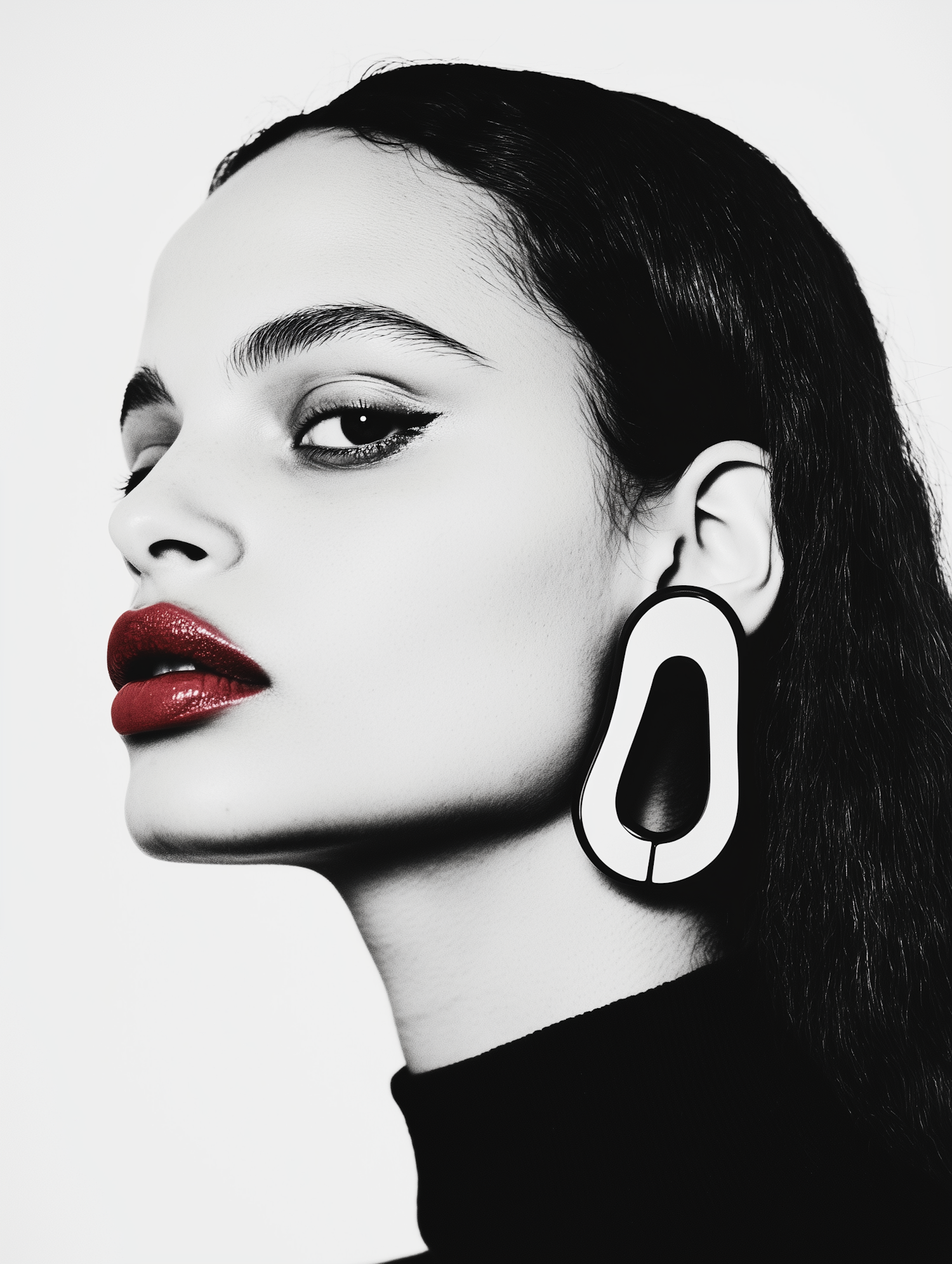 Bold black-and-white portrait with red lips, dramatic eyeliner, and abstract white earrings. A modern, artistic aesthetic shines through.