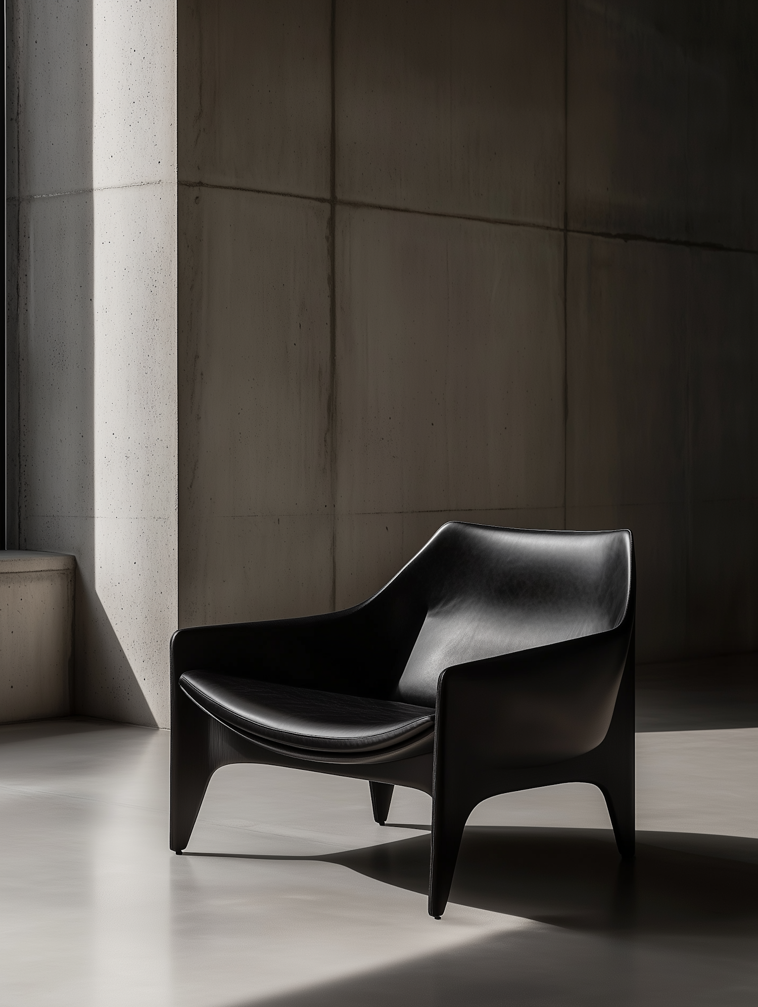 Modern black leather armchair in a minimalist concrete interior, bathed in soft natural light with striking shadows and clean lines.