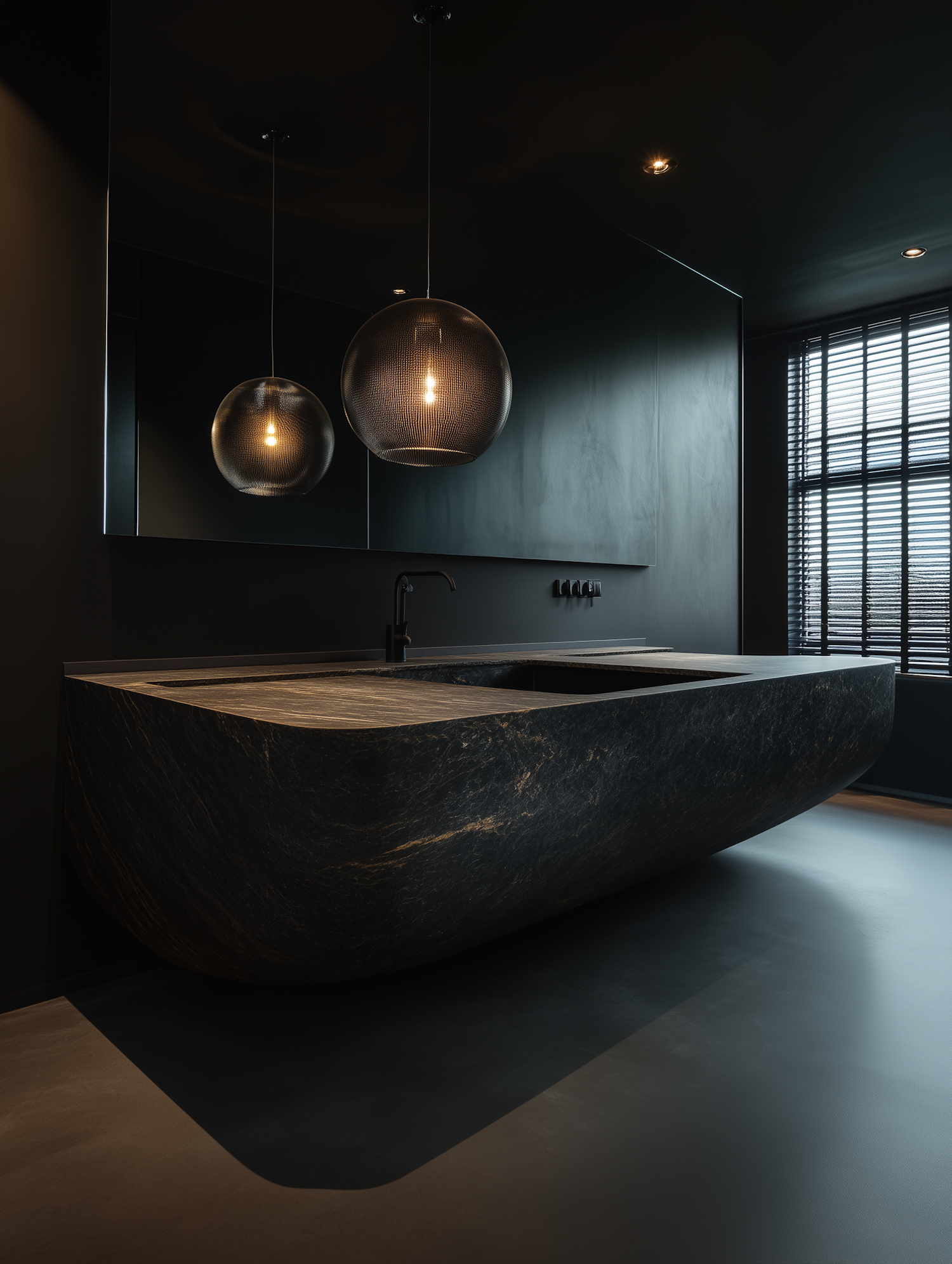 Modern black bathroom with a sculptural marble sink, textured pendant lights, and dramatic matte black walls for a sleek, minimalist vibe.