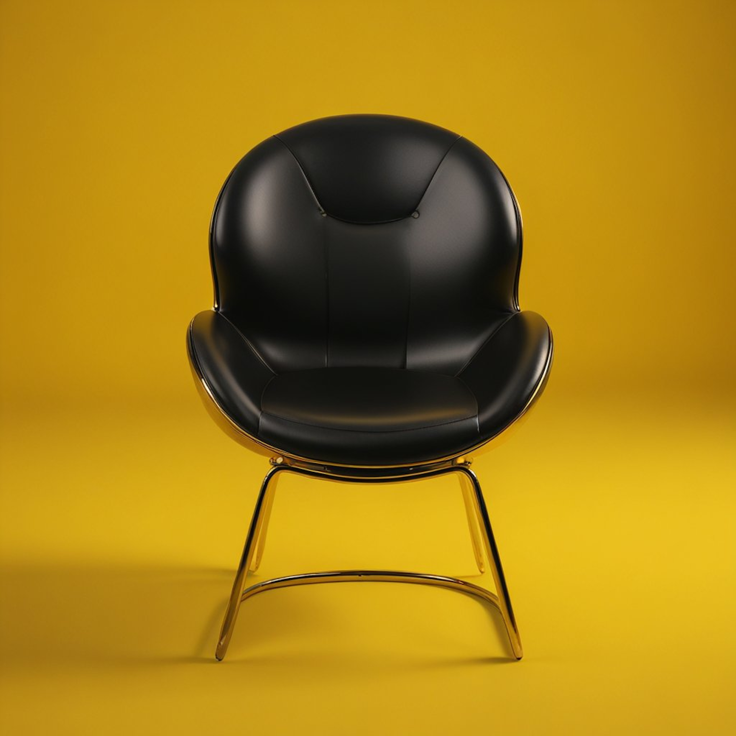Modern black leather chair with a golden metal frame against a vibrant yellow background, combining luxury and minimalist design.