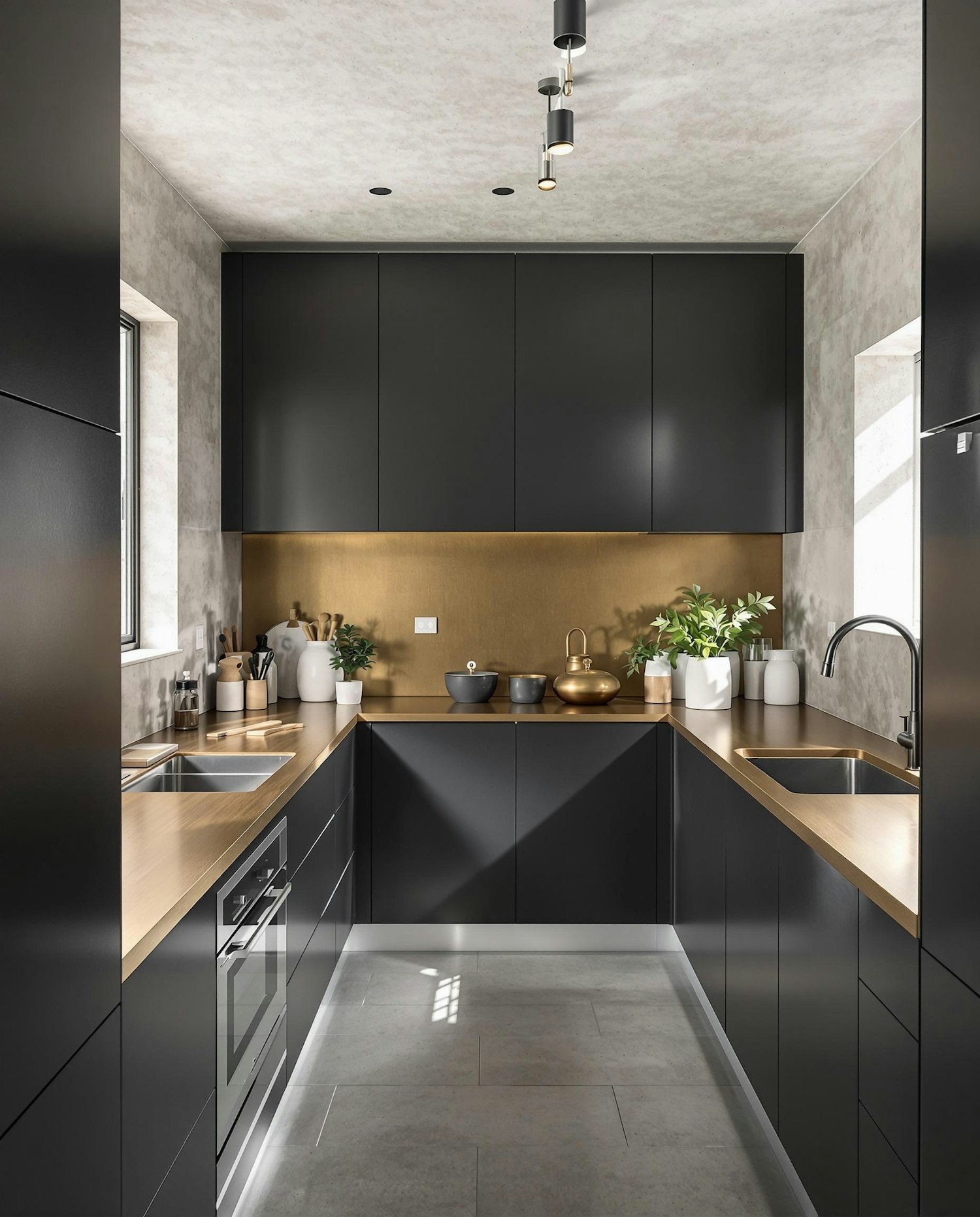 Modern U-shaped kitchen with matte black cabinets, gold accents, and natural light. Features sleek appliances and minimalist decor.