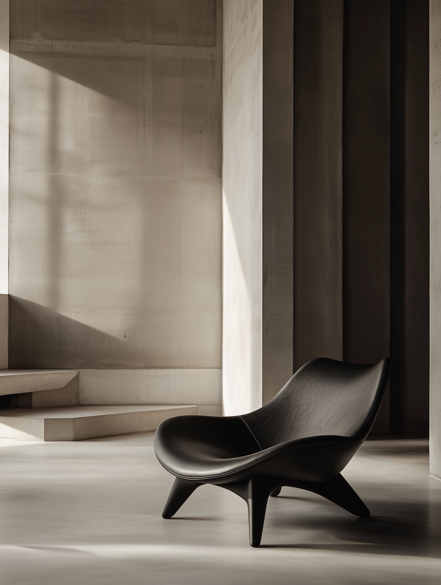 Modern black lounge chair in a minimalist concrete interior with soft sunlight and shadows, creating a sleek and industrial aesthetic.