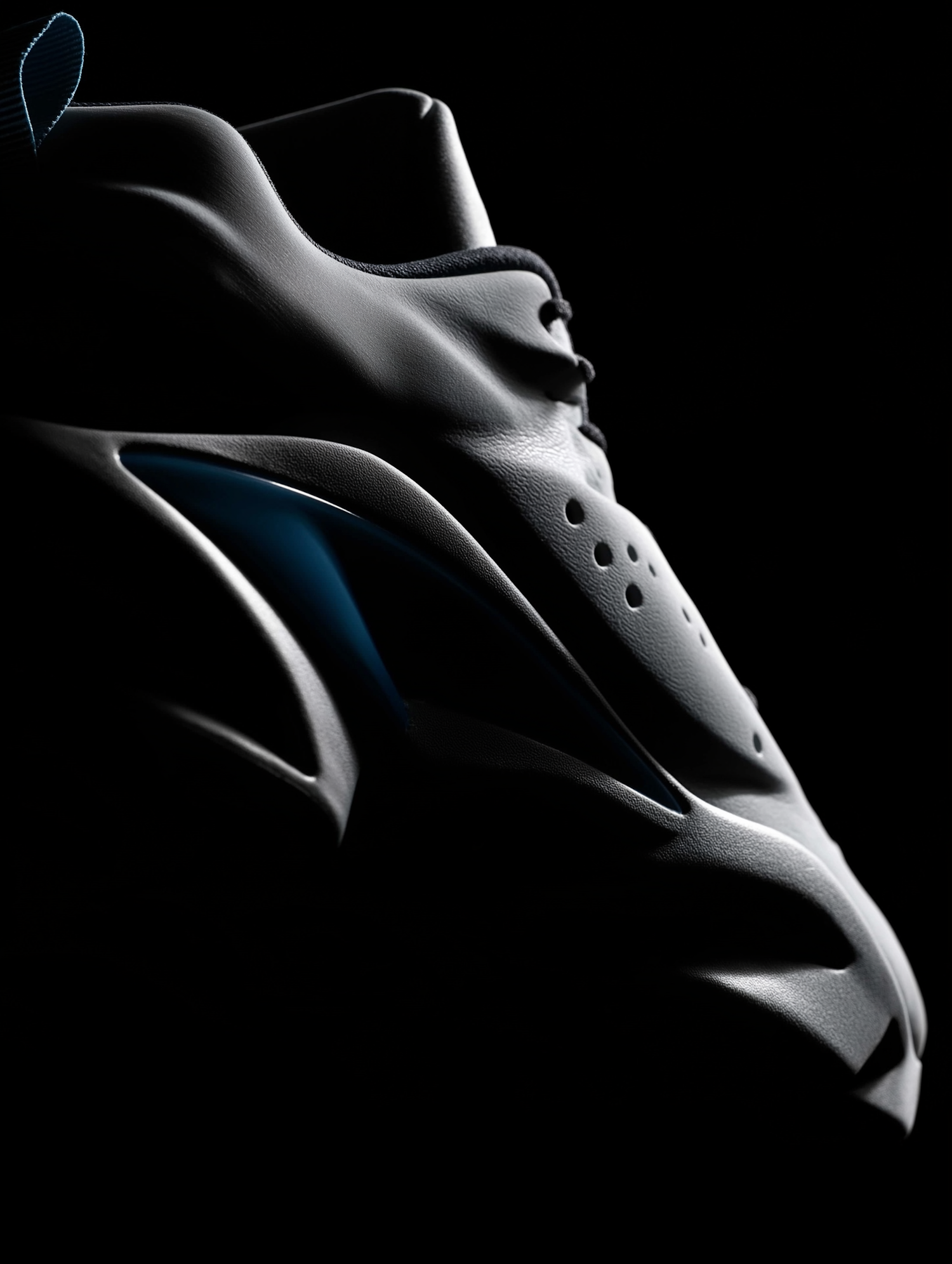 Close-up of a sleek black sneaker with blue accents, highlighting its modern design and texture against a black background.