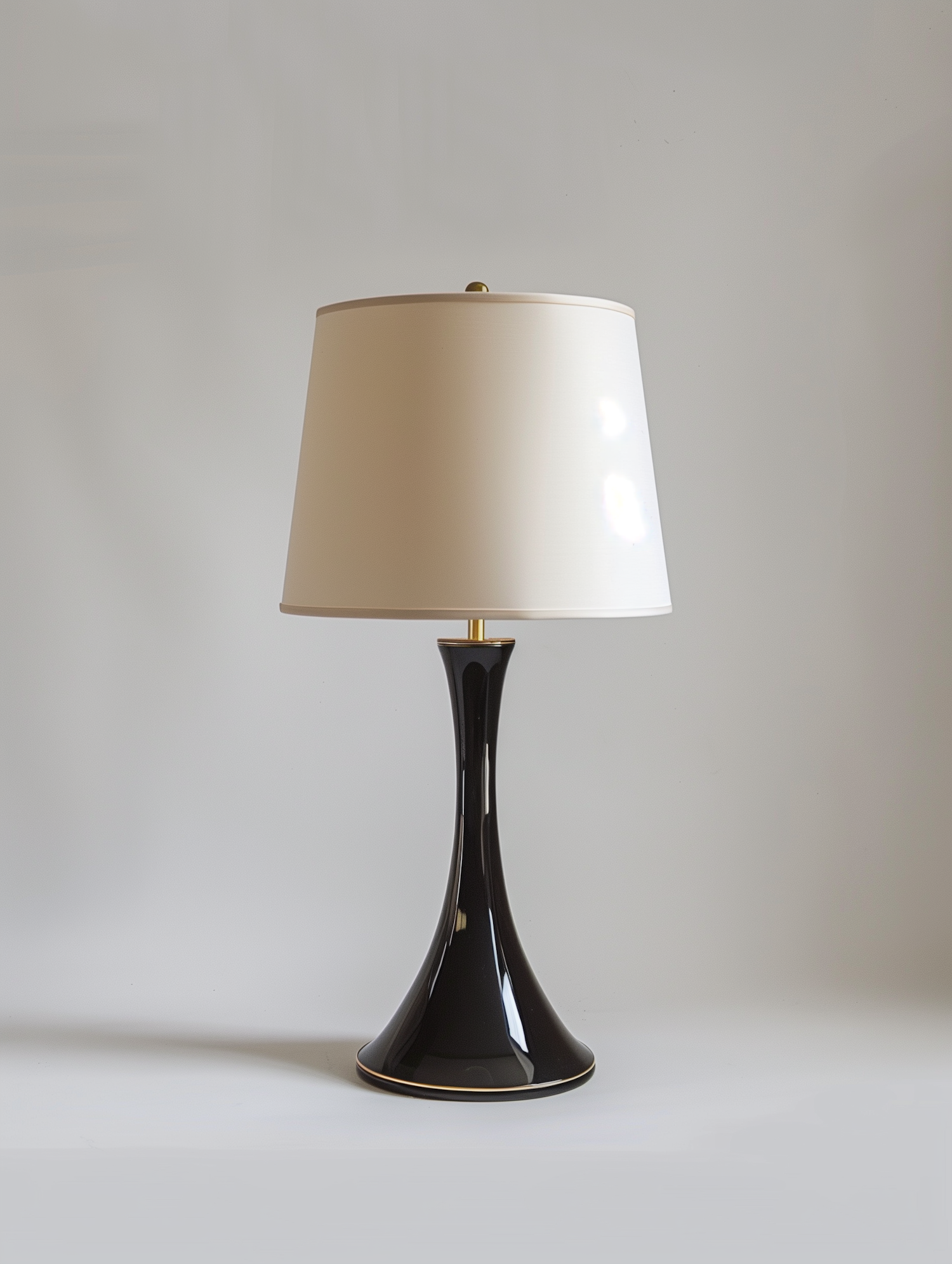 Modern table lamp with a glossy black base, gold accents, and an off-white fabric shade. Perfect for adding elegance to any space.