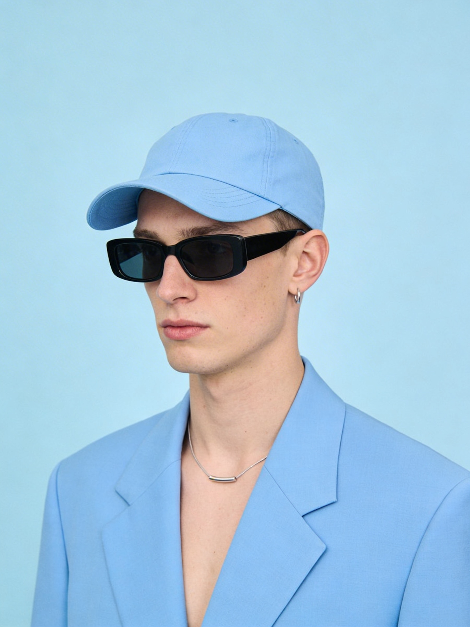 A crisp monochrome baby-blue studio portrait of a white man wearing a powder-blue blazer, matching cap, matte black sunglasses, and minimal silver jewelry. The baby‑blue background blends seamlessly with the outfit. High-resolution, pastel-clean, and modern with a soft editorial edge.