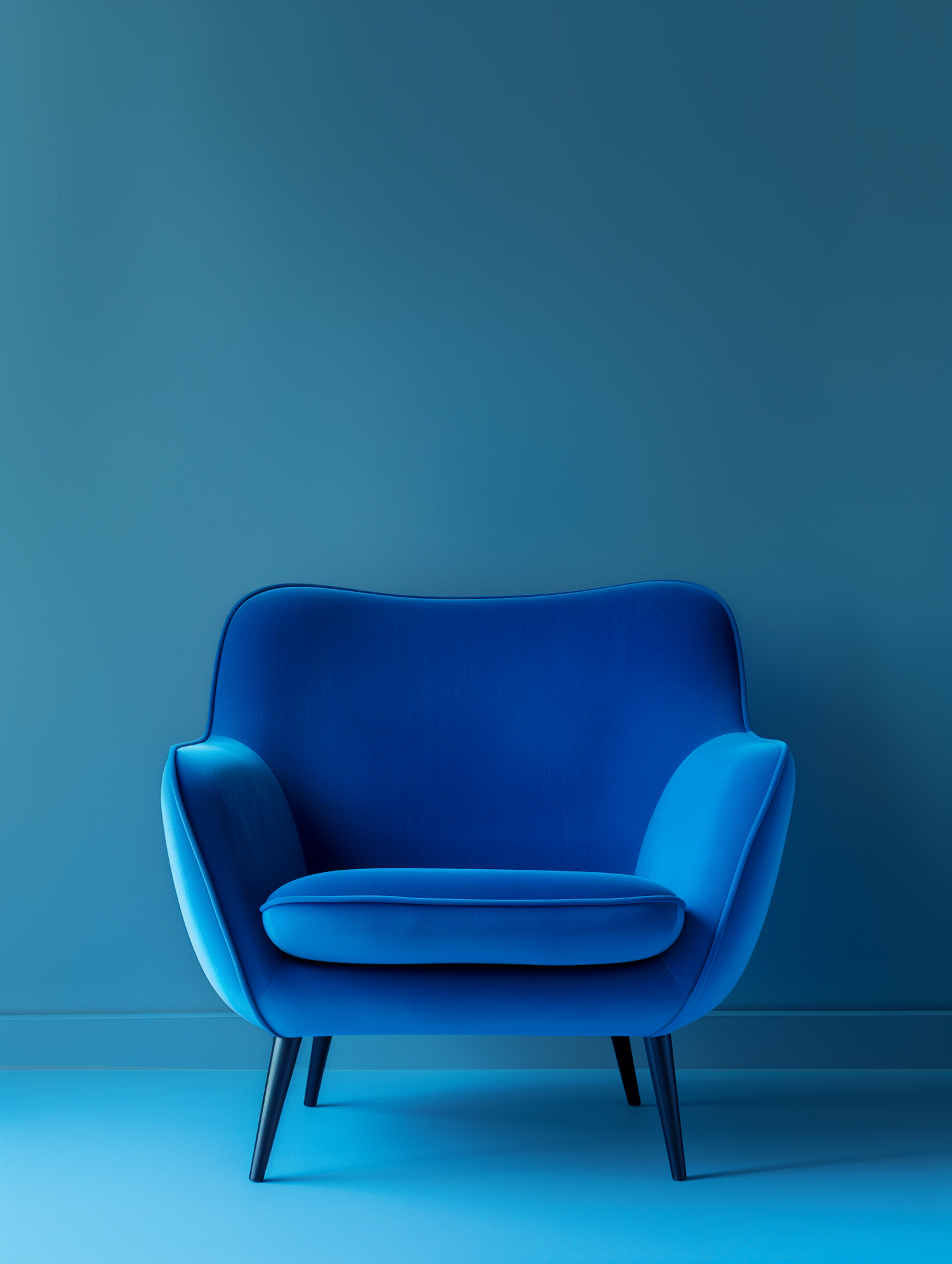 A sleek royal blue armchair with curved design and black legs, set against a matching blue wall and floor for a bold, modern look.