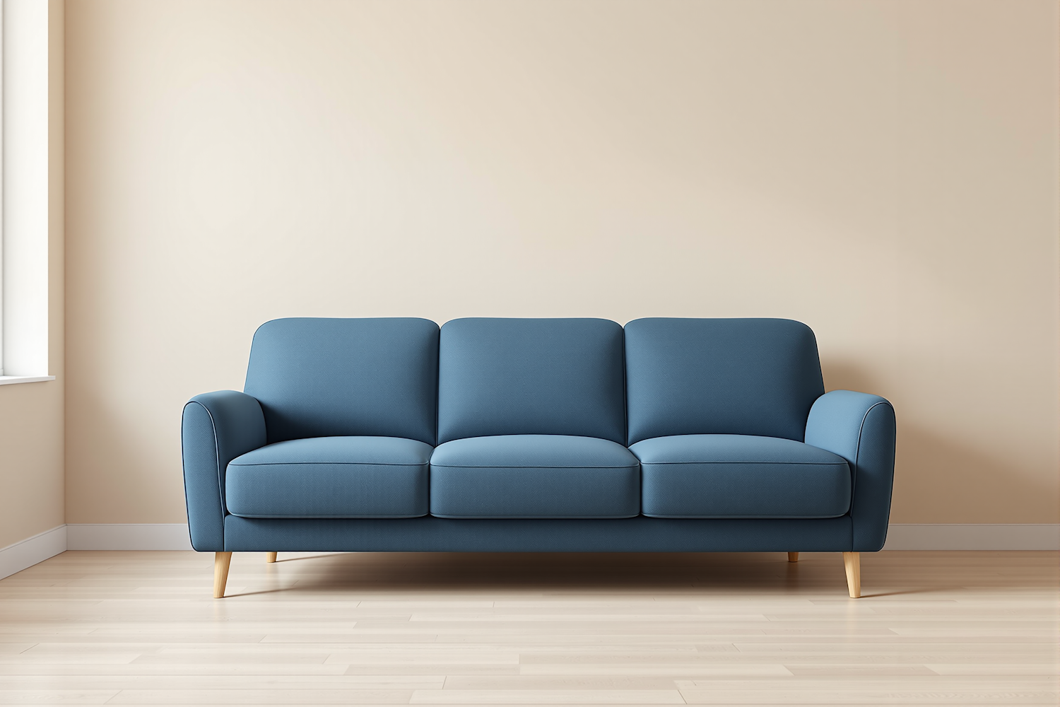 A stylish blue three-seater sofa with wooden legs, set against a beige wall and light wooden floor, perfect for modern interiors.