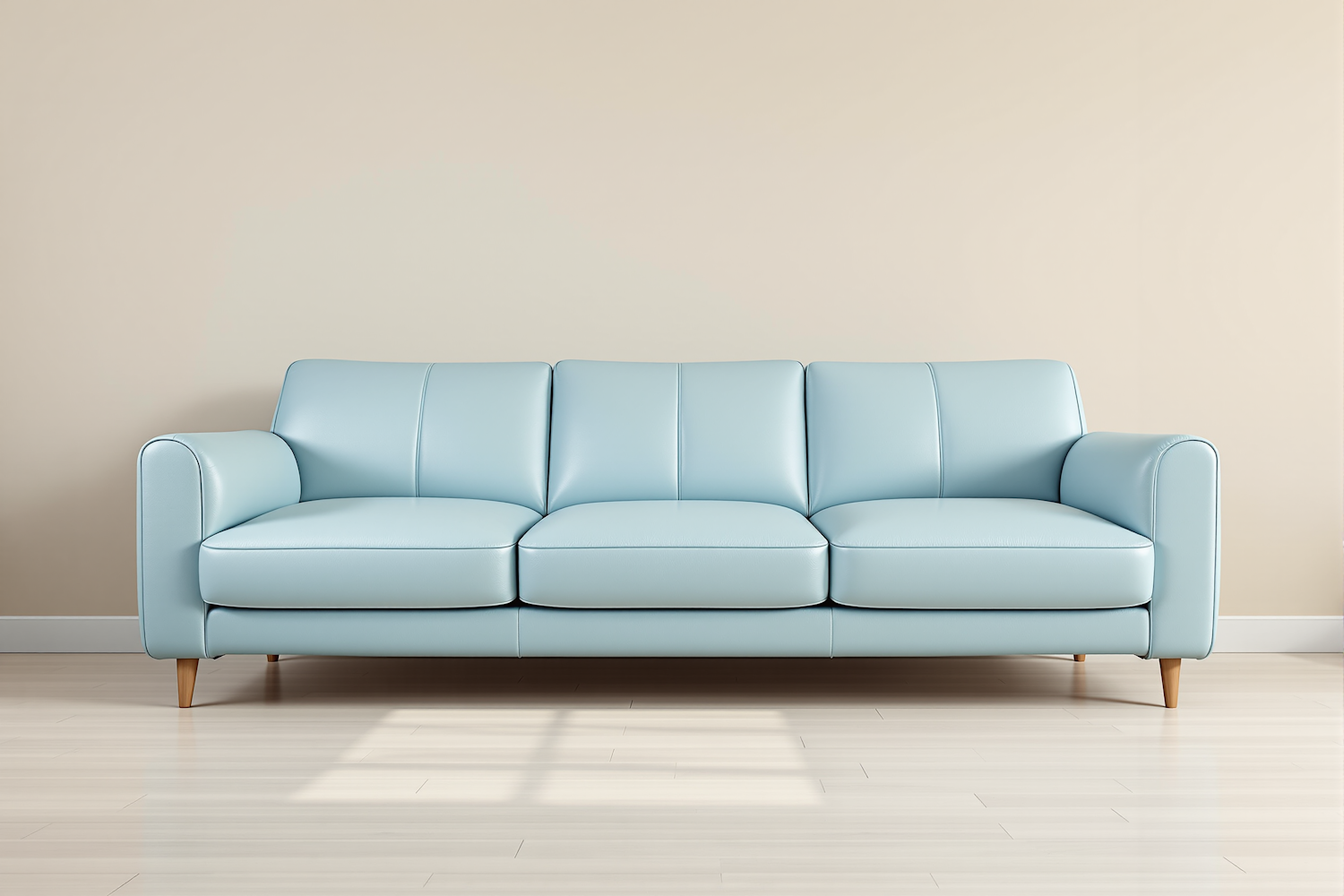 A stylish light blue sofa with wooden legs against a beige wall, perfect for modern interiors. Soft lighting enhances its sleek design.