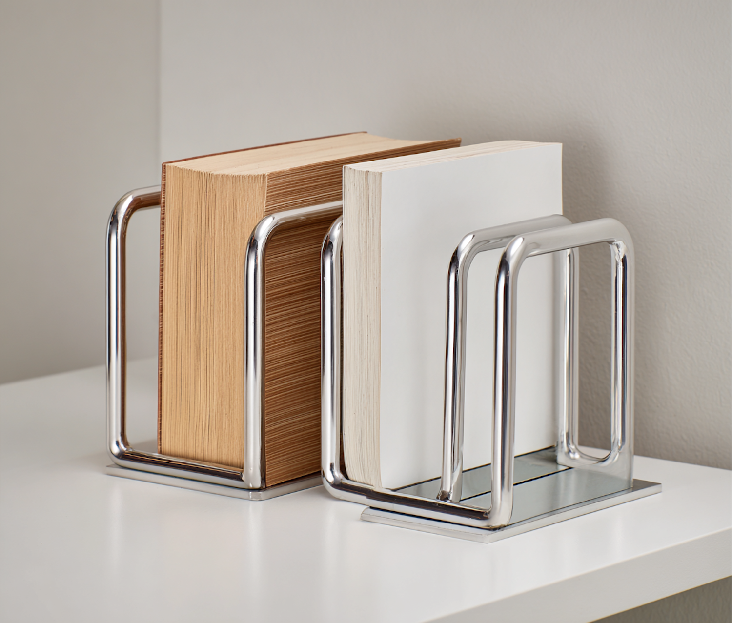 Minimalist chrome bookends holding two books on a white surface, showcasing a clean and modern design for home or office decor.