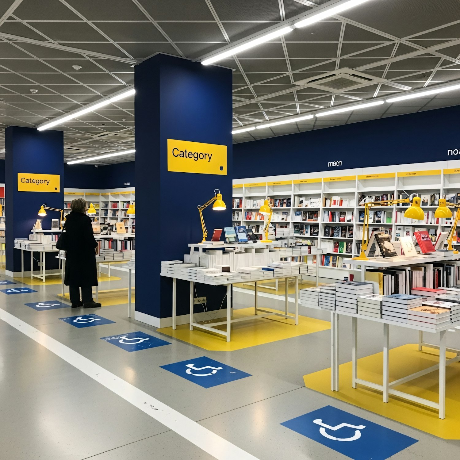 Modern bookstore with blue and yellow decor, accessible design, and neatly arranged books on white shelves and tables.