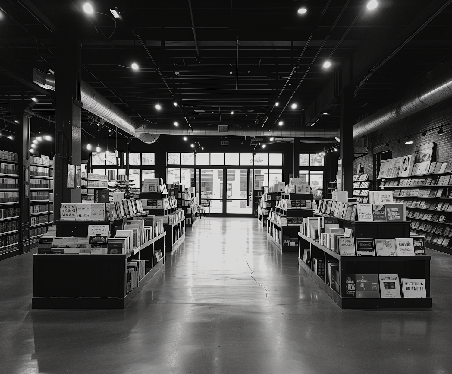 Modern industrial bookstore with polished concrete floors, dark wooden shelves, and large windows. A calm and inviting space for book lovers.