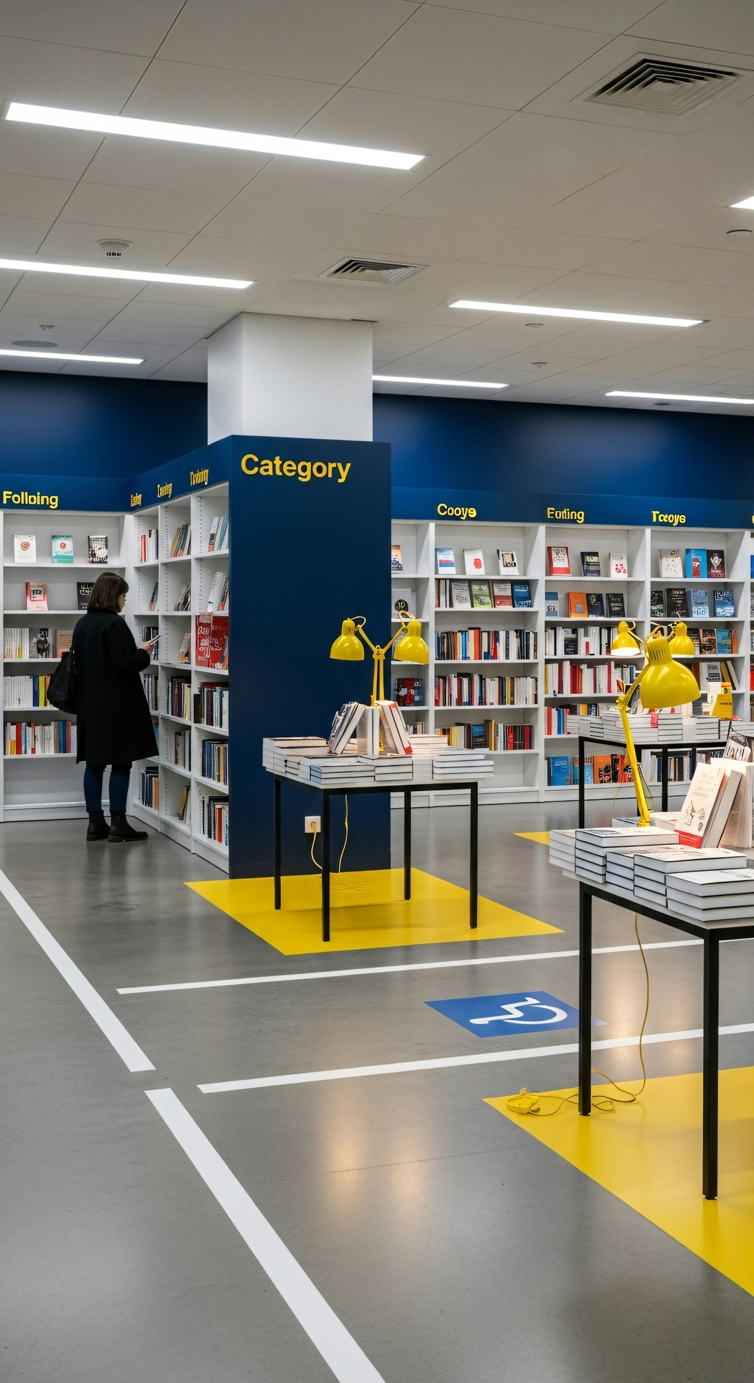 Bright and modern bookstore with organized shelves, yellow accents, and a person browsing books in a clean, inviting space.