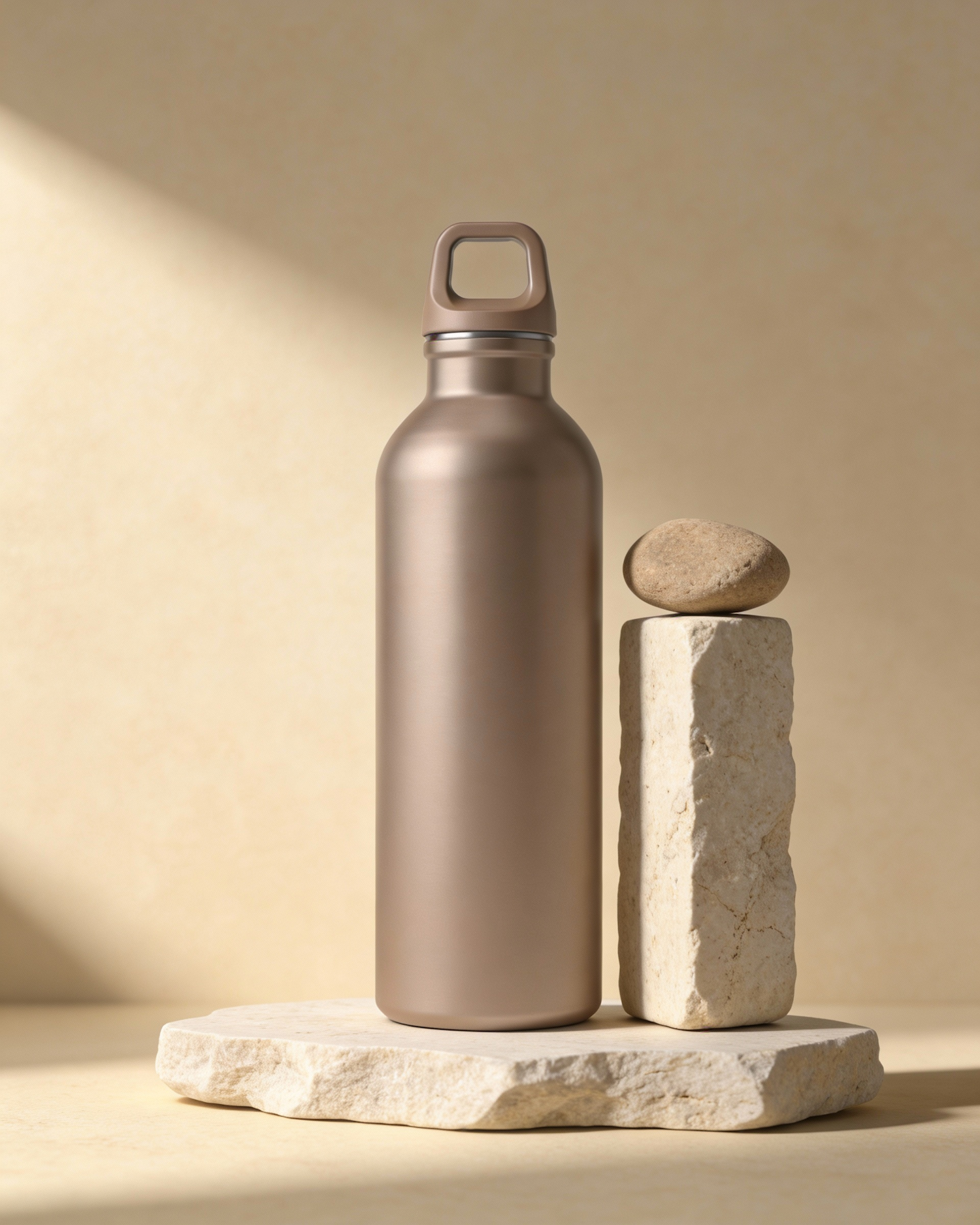 A minimalist scene featuring a matte metallic water bottle and balanced stones on a textured platform, set against a warm-toned background.