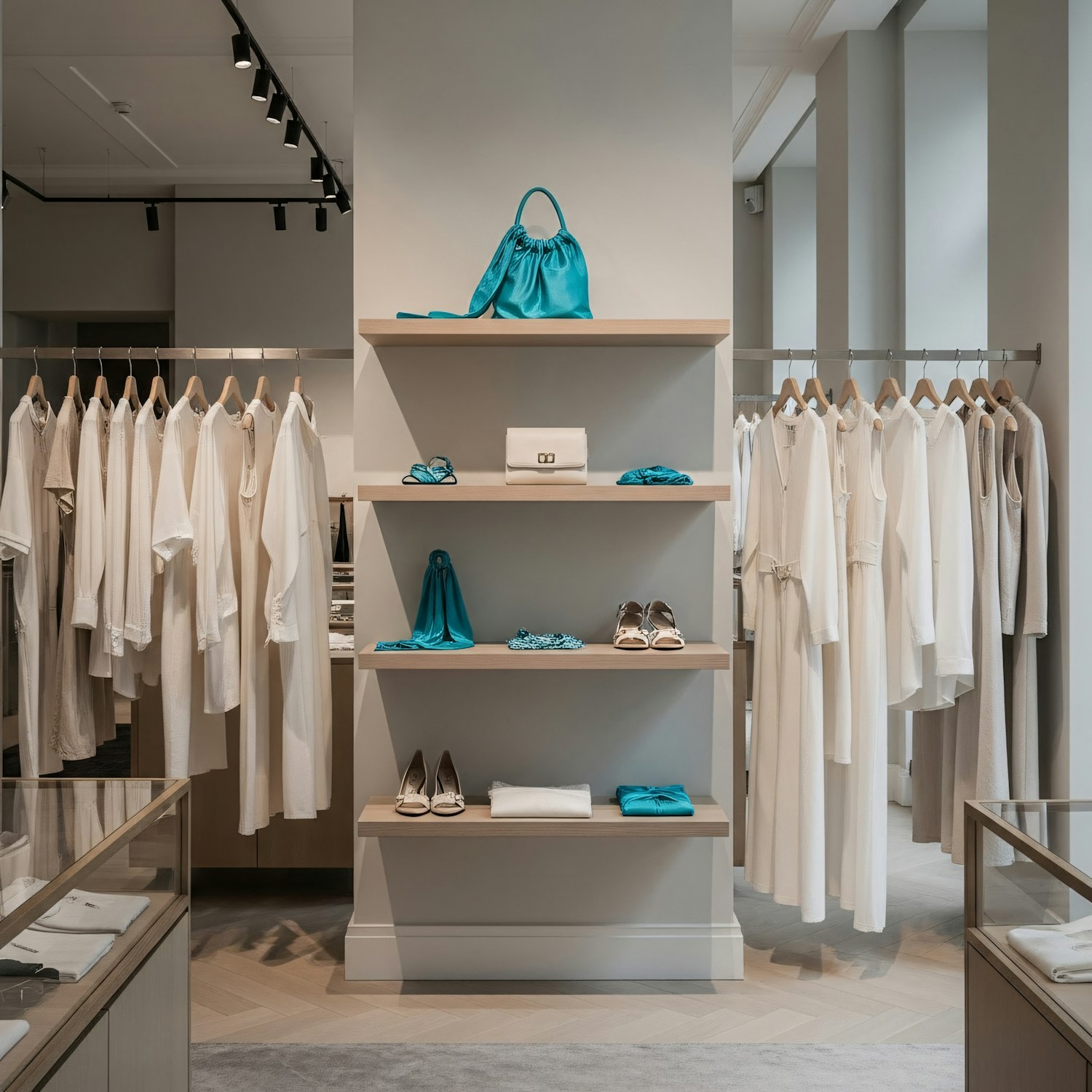 Chic boutique interior with turquoise accessories and white clothing on display, creating a clean and modern shopping experience.