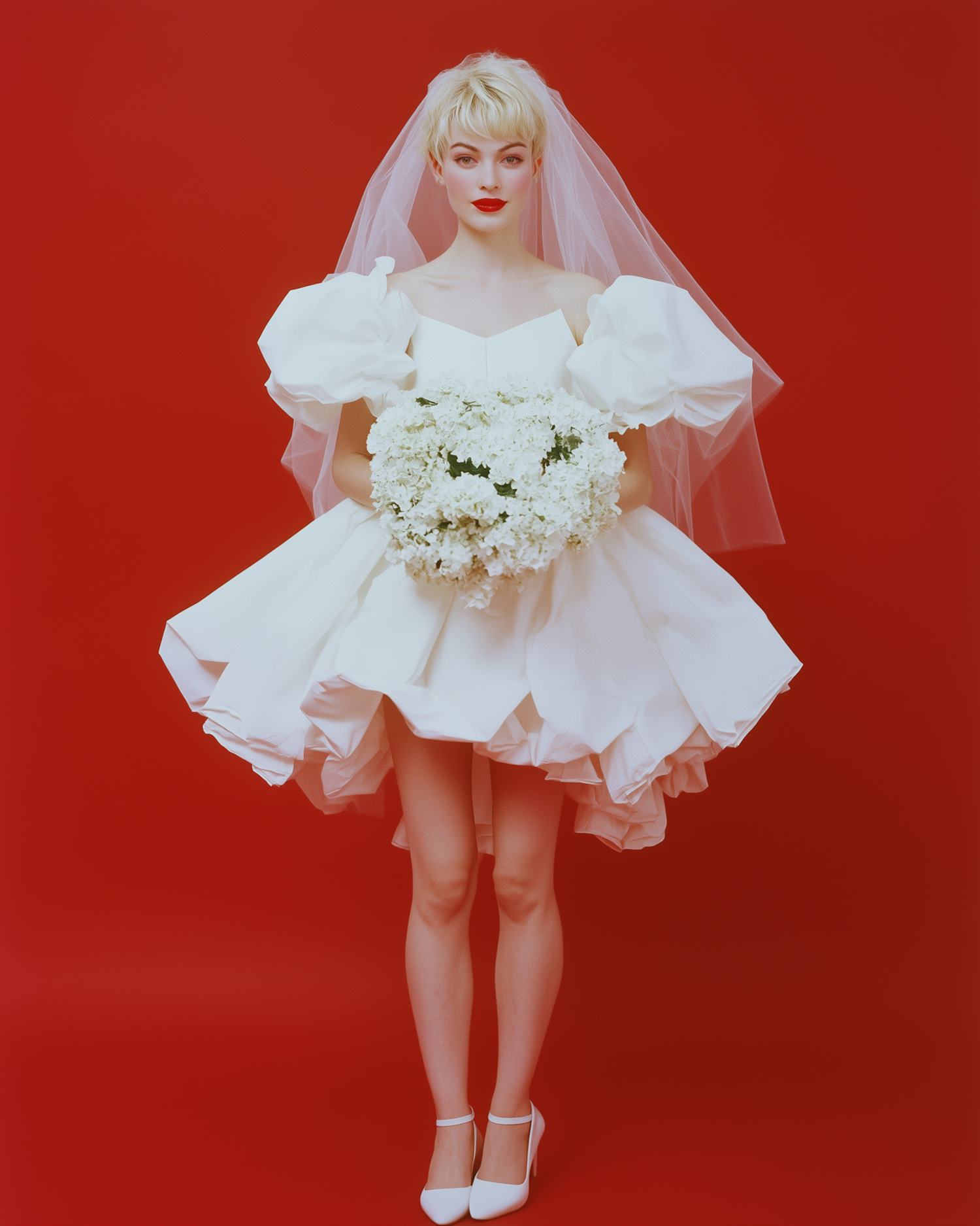 Caucasian woman in a short white wedding dress with puffed sleeves, holding a bouquet, against a red background. Bold red lipstick.
