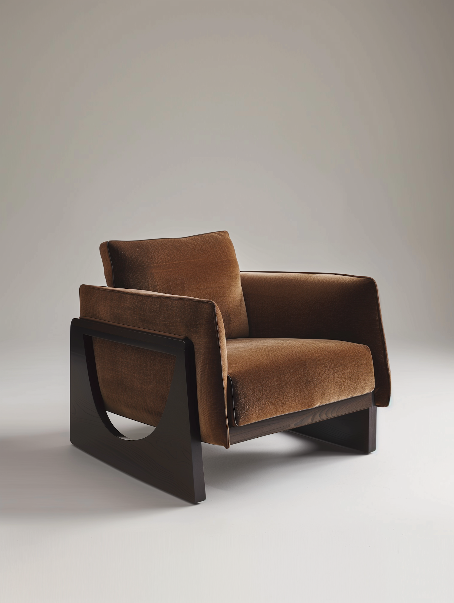 Modern brown armchair with plush upholstery and a dark wood geometric frame, perfect for contemporary interiors.