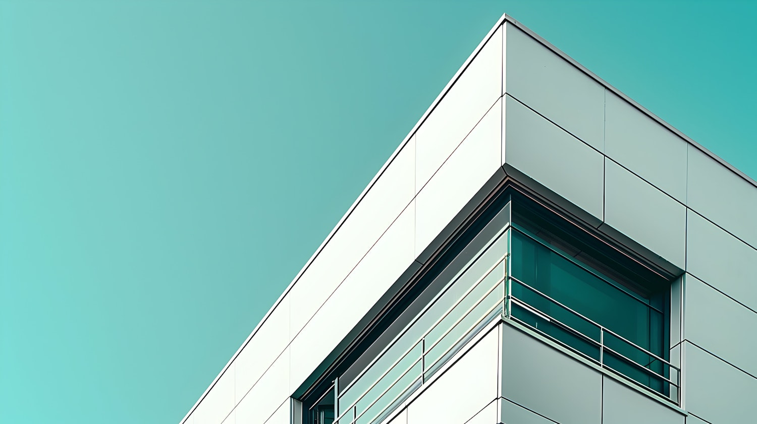 Modern building corner with sleek design, white panels, and teal-tinted window against a vibrant teal sky.
