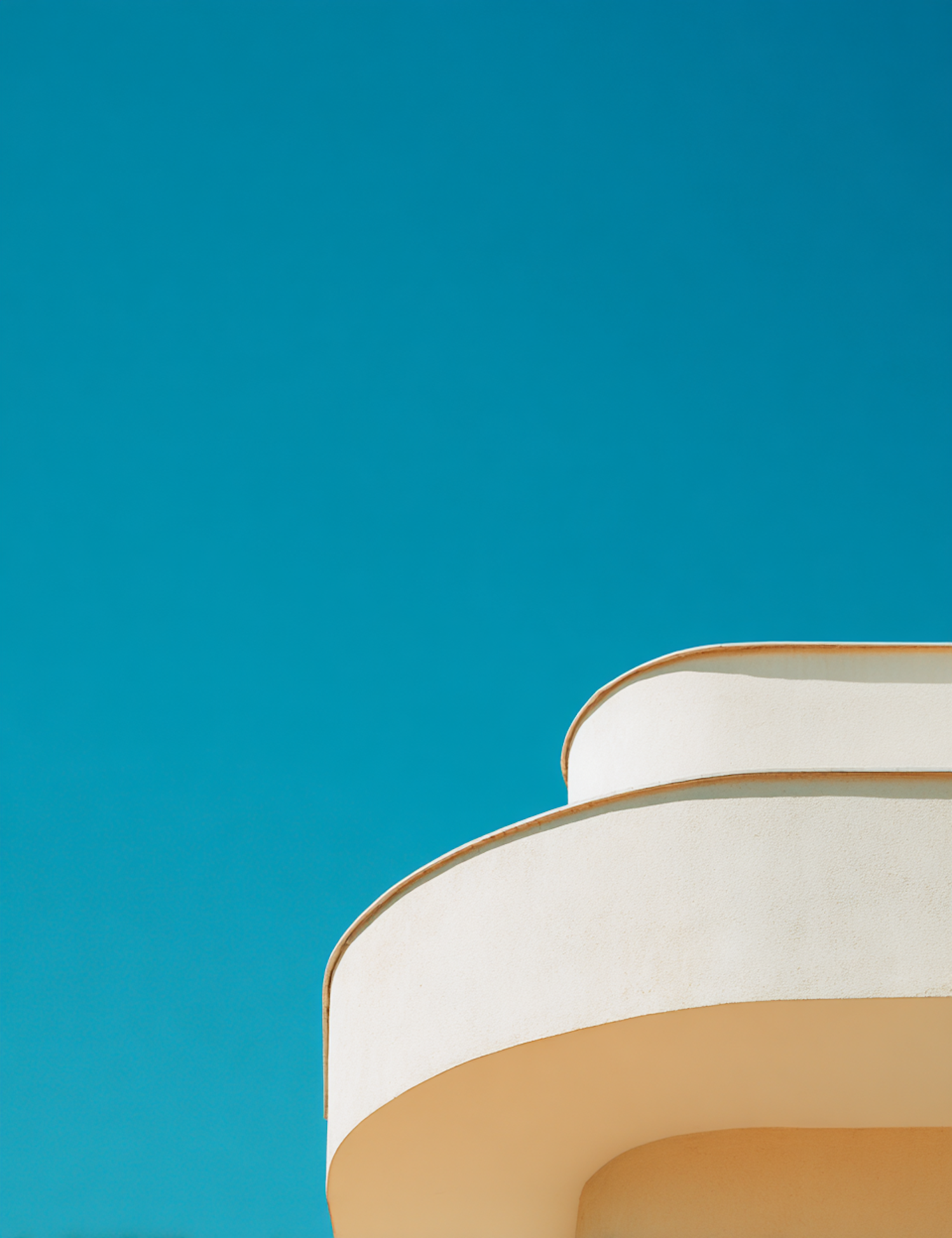 Minimalist architecture with smooth curves against a vibrant blue sky, showcasing modern design and clean lines.