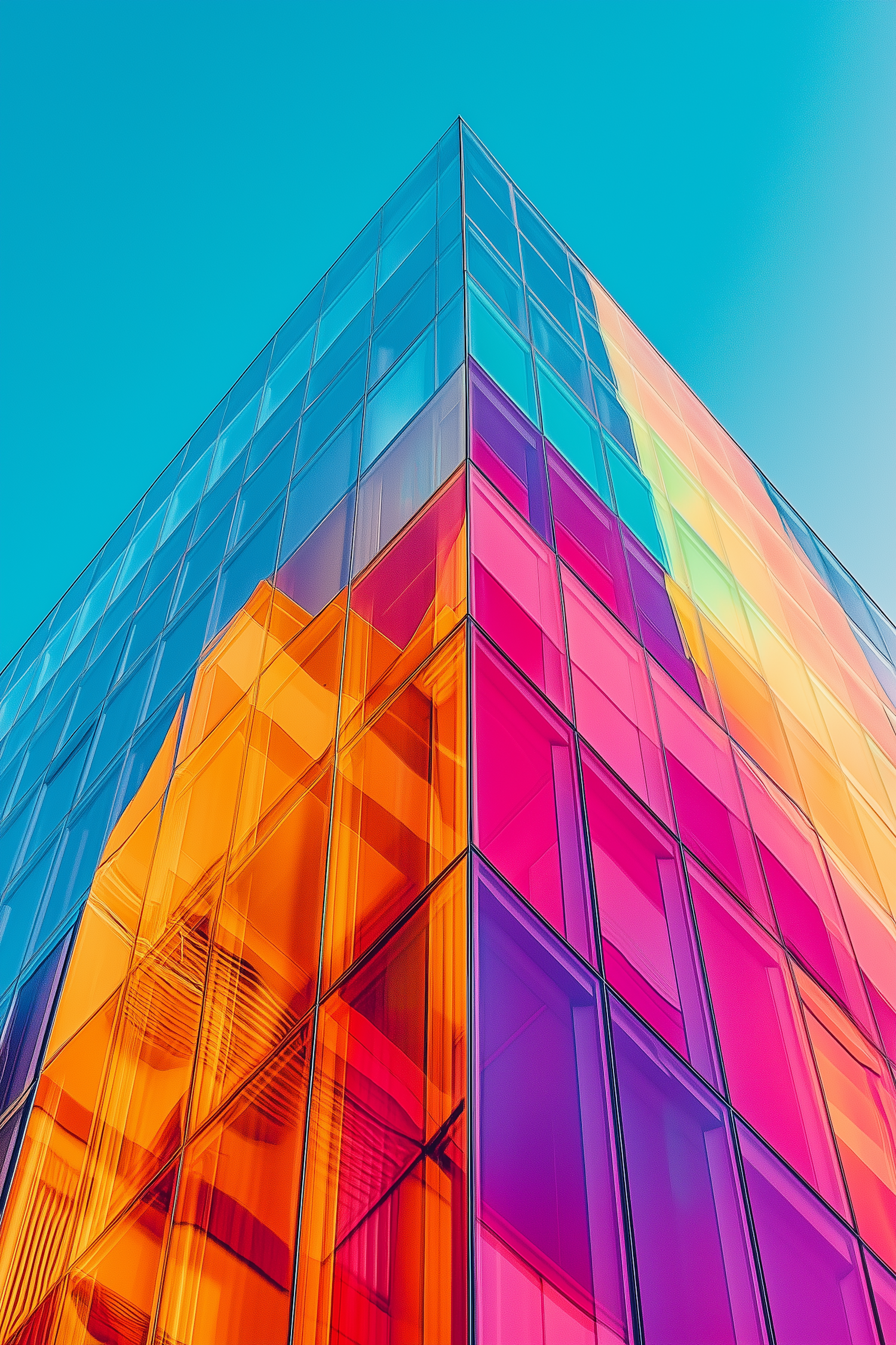 Vibrant modern building with colorful glass panels against a clear blue sky, showcasing dynamic architecture and vivid hues.