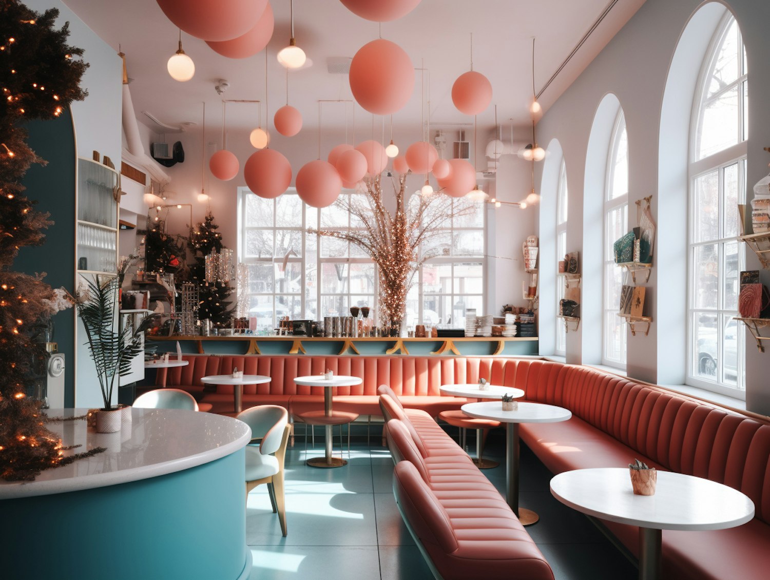 Chic café interior with pink pendant lights, red leather seating, and festive decor. Bright, airy space with large arched windows.