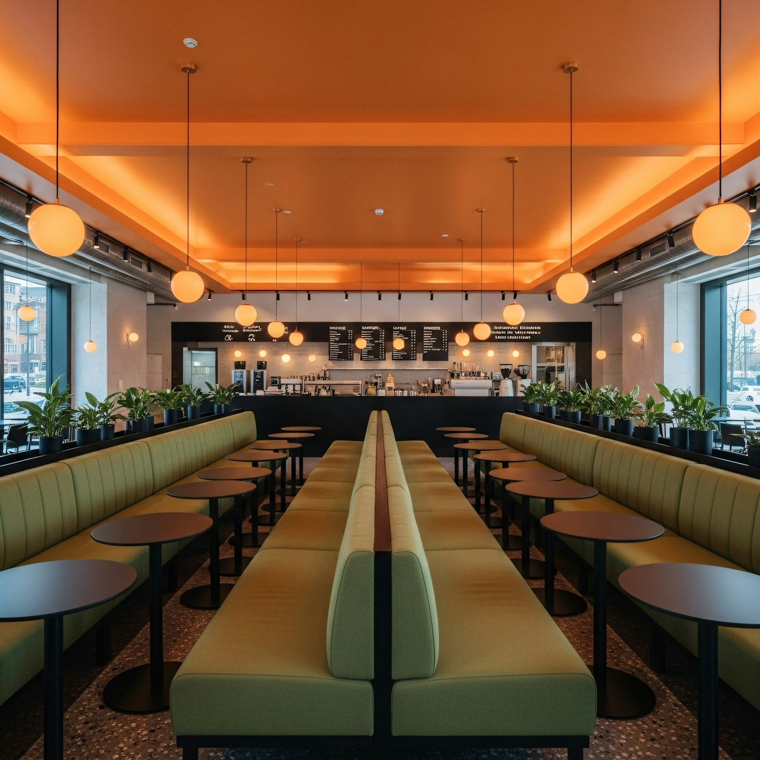 Modern cafe interior with orange ceiling, green seating, black tables, and warm lighting. Potted plants add a fresh touch to the space.